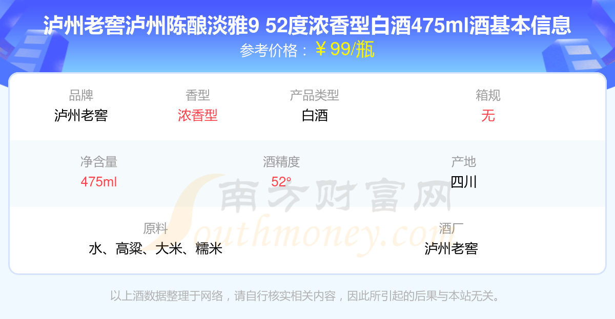 瀘州老窖瀘州陳釀淡雅9 52度濃香型白酒475ml基本信息