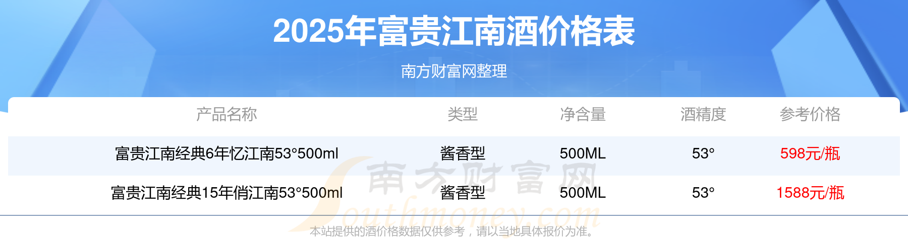 2025年富貴江南酒富貴江南經(jīng)典15年俏江南53°500ml、富貴江南經(jīng)典6年憶江南53°500ml等最新價格如下:
