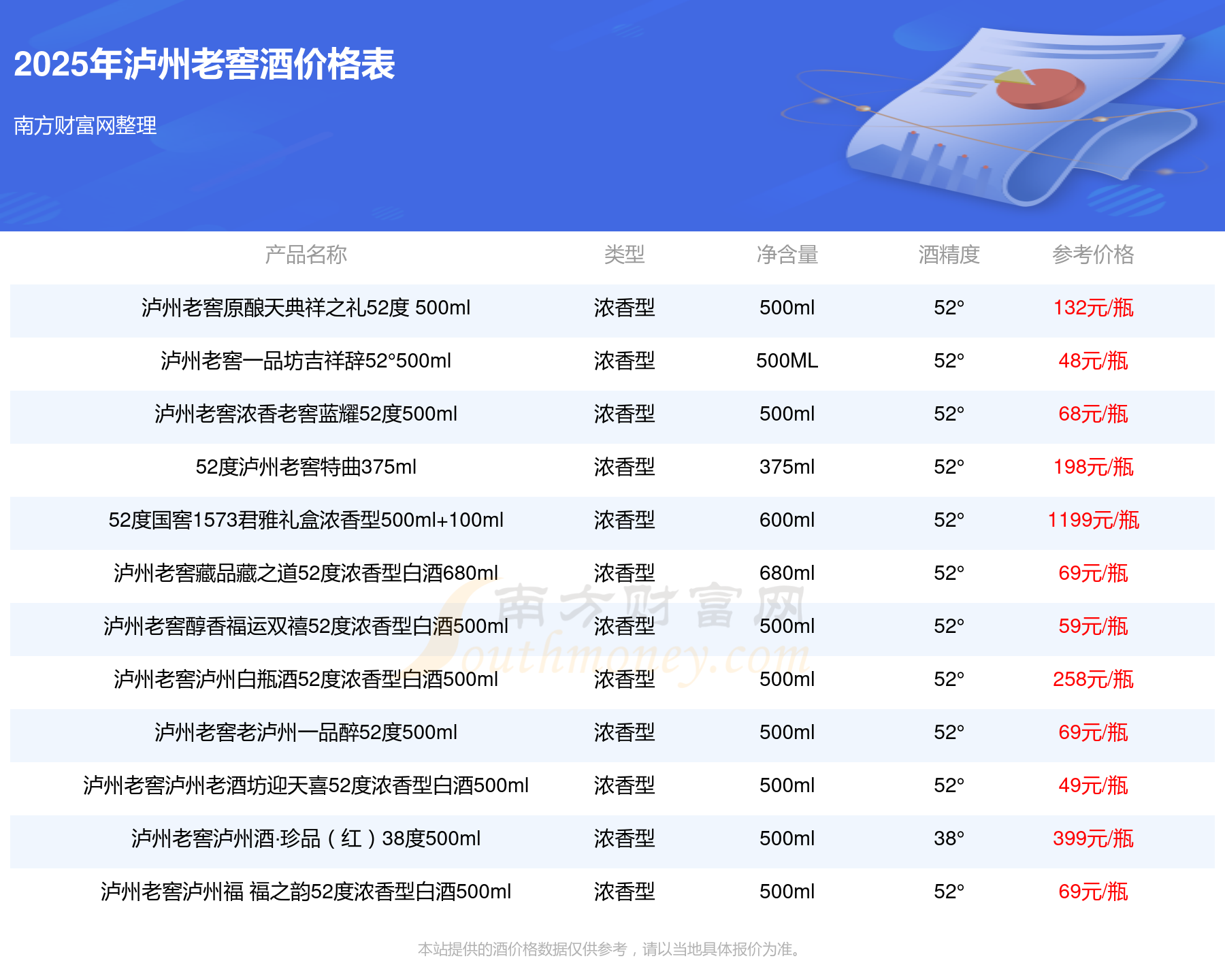 瀘州老窖國窖1573春釀鼠兆豐年E 55度參考價17999元/瓶、瀘州老窖國窖1573生命中的那壇酒55度014參考價9999元/瓶、瀘州老窖國窖1573春釀鼠兆豐年A 55度參考價5088元/瓶、瀘州老窖國窖1573生命中的那壇酒55度013濃香型白酒1000ml參考價4988元/瓶、瀘州老窖國窖1573生命中的那壇酒55度009 1000ml參考價4288元/瓶、瀘州老窖國窖1573中國品味52度濃香型白酒500ml參考價2888元/瓶。