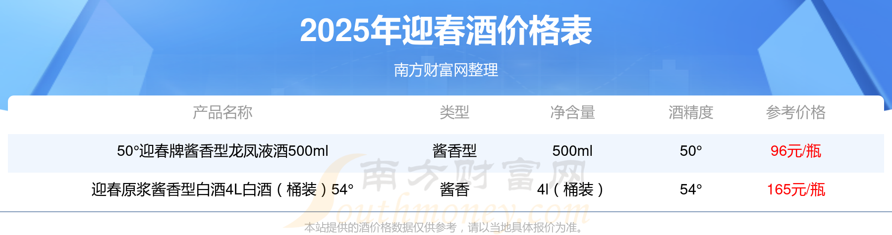 2025年,迎春原漿醬香型白酒4L白酒(桶裝)54°、50°迎春牌醬香型龍鳳液酒500ml等迎春酒價(jià)格如下:迎春原漿醬香型白酒4L白酒(桶裝)54°參考價(jià)165元/瓶、50°迎春牌醬香型龍鳳液酒500ml參考價(jià)96元/瓶。