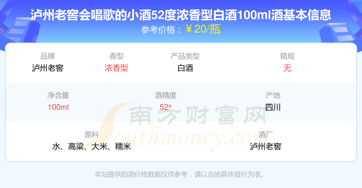 瀘州老窖會(huì)唱歌的小酒52度濃香型白酒100ml基本信息