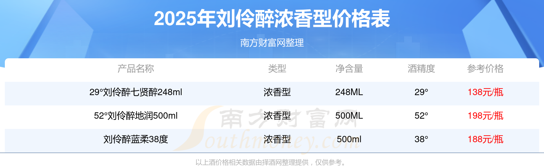 劉伶醉濃香型酒最新價(jià)格2025:52°劉伶醉地潤(rùn)500ml參考價(jià)198元/瓶、劉伶醉藍(lán)柔38度參考價(jià)188元/瓶、29°劉伶醉七賢醉248ml參考價(jià)138元/瓶。