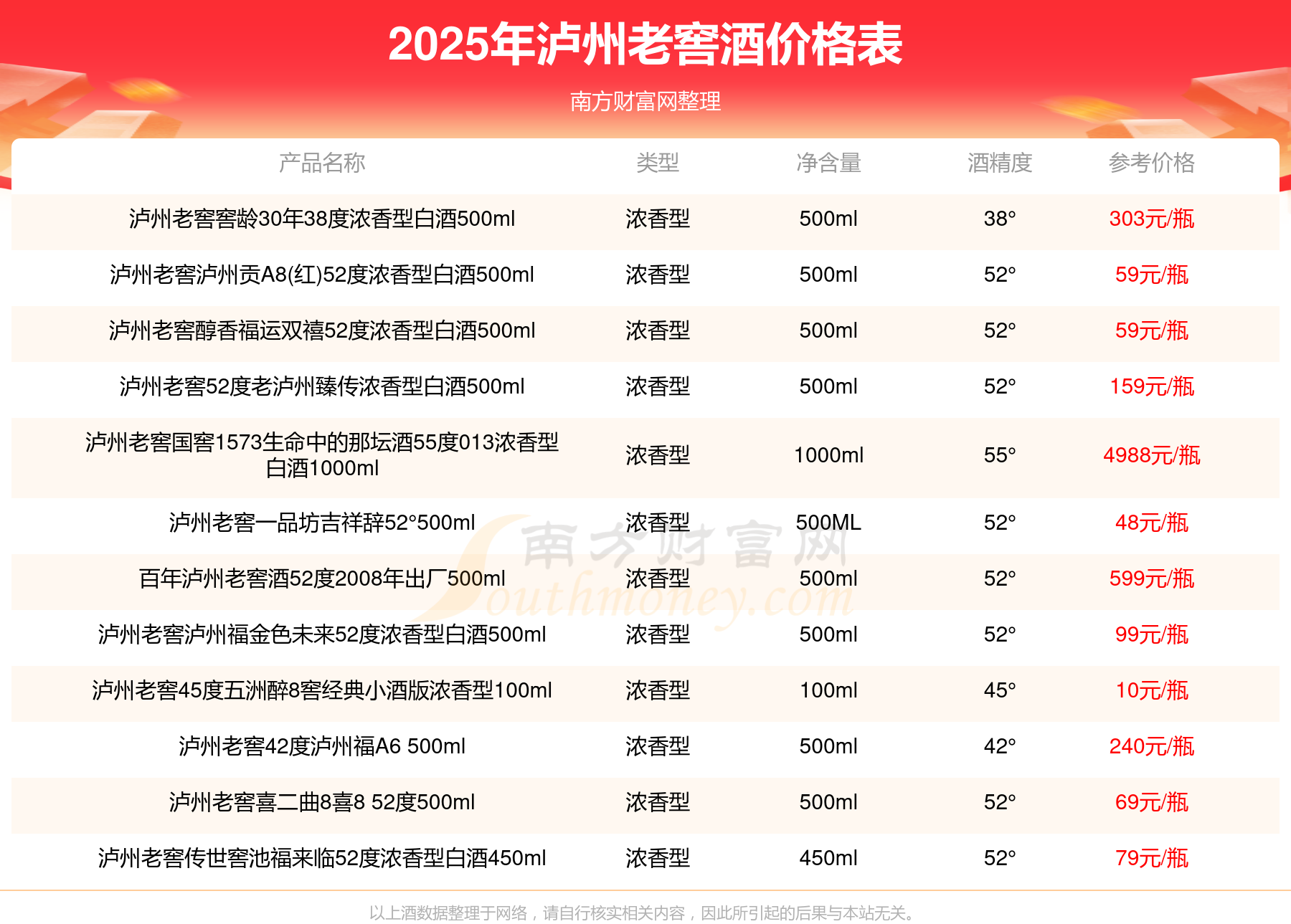 2025年,瀘州老窖國窖1573春釀鼠兆豐年E 55度、瀘州老窖國窖1573生命中的那壇酒55度014、瀘州老窖國窖1573春釀鼠兆豐年A 55度、瀘州老窖國窖1573生命中的那壇酒55度013濃香型白酒1000ml、瀘州老窖國窖1573生命中的那壇酒55度009 1000ml、瀘州老窖國窖1573中國品味52度濃香型白酒500ml、瀘州老窖國窖1573許燎源概念作品58度濃香型白酒1000ml等瀘州老窖酒價格如下:瀘州老窖國窖1573春釀鼠兆豐年E 55度參考價17999元/瓶、瀘州老窖國窖1573生命中的那壇酒55度014參考價9999元/瓶、瀘州老窖國窖1573春釀鼠兆豐年A 55度參考價5088元/瓶、瀘州老窖國窖1573生命中的那壇酒55度013濃香型白酒1000ml參考價4988元/瓶、瀘州老窖國窖1573生命中的那壇酒55度009 1000ml參考價4288元/瓶、瀘州老窖國窖1573中國品味52度濃香型白酒500ml參考價2888元/瓶、瀘州老窖國窖1573許燎源概念作品58度濃香型白酒1000ml參考價2680元/瓶。