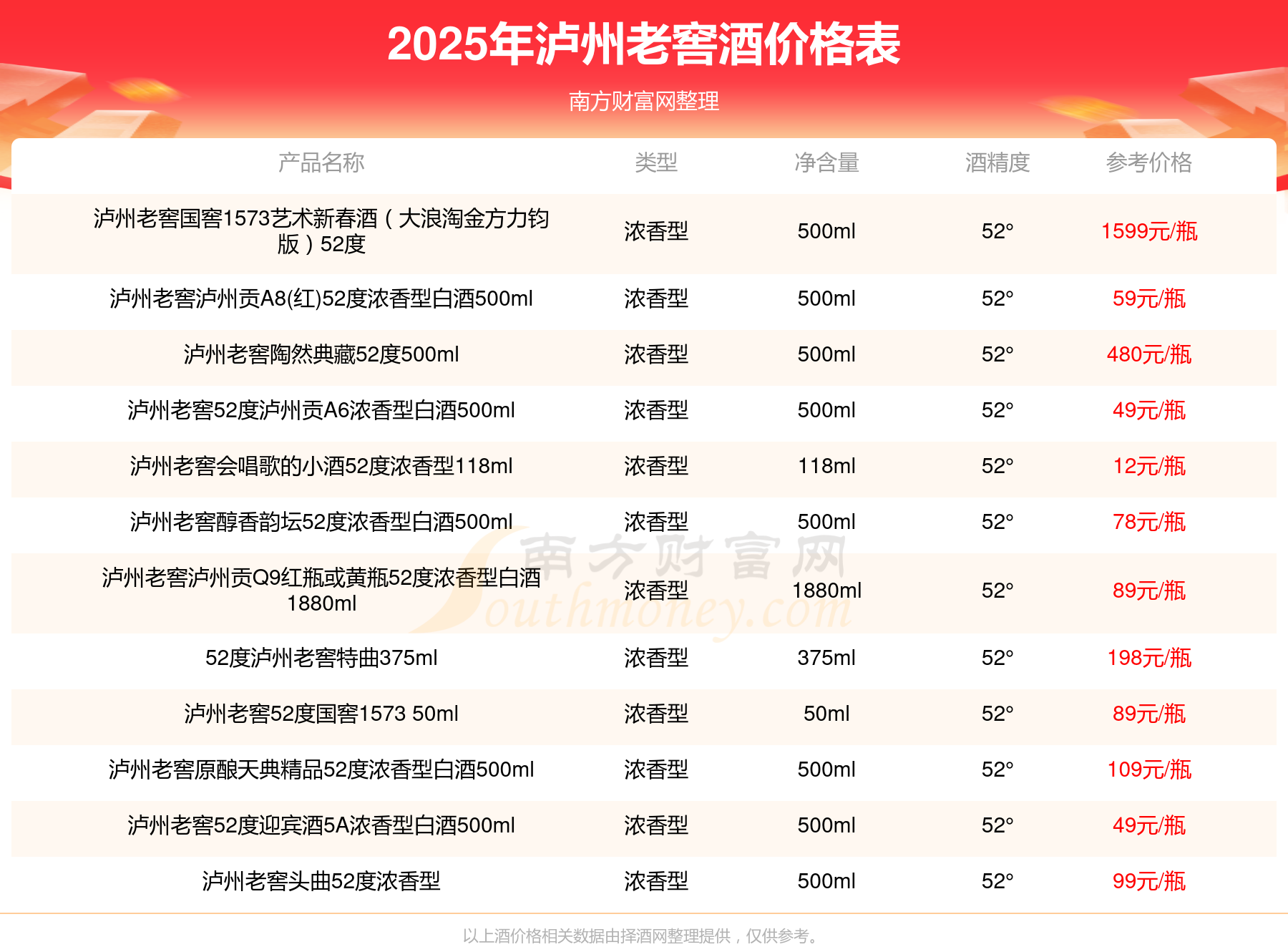 瀘州老窖國窖1573春釀鼠兆豐年E 55度參考價17999元/瓶、瀘州老窖國窖1573生命中的那壇酒55度014參考價9999元/瓶、瀘州老窖國窖1573春釀鼠兆豐年A 55度參考價5088元/瓶、瀘州老窖國窖1573生命中的那壇酒55度013濃香型白酒1000ml參考價4988元/瓶、瀘州老窖國窖1573生命中的那壇酒55度009 1000ml參考價4288元/瓶、瀘州老窖國窖1573中國品味52度濃香型白酒500ml參考價2888元/瓶、瀘州老窖國窖1573許燎源概念作品58度濃香型白酒1000ml參考價2680元/瓶、瀘州老窖52度國窖1573狗年生肖禮盒參考價2143元/瓶。