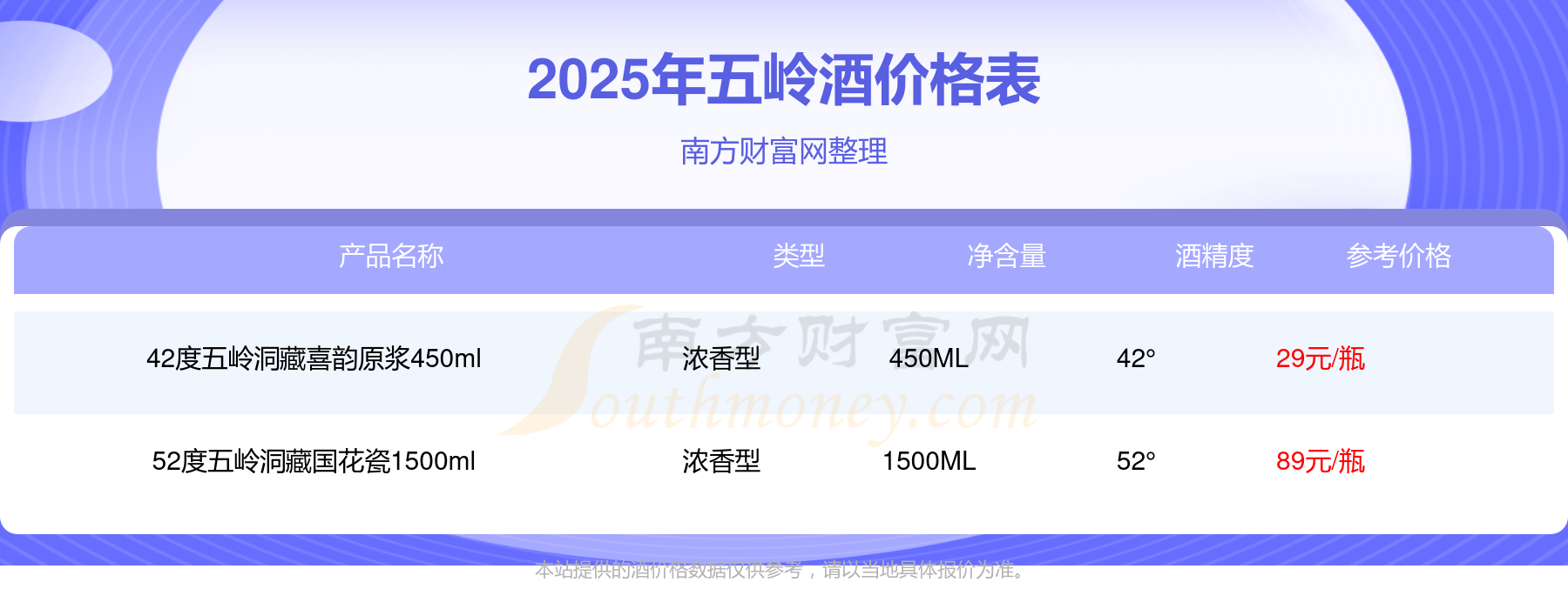2025年,52度五嶺洞藏國(guó)花瓷1500ml、42度五嶺洞藏喜韻原漿450ml等五嶺酒價(jià)格如下:52度五嶺洞藏國(guó)花瓷1500ml參考價(jià)89元/瓶、42度五嶺洞藏喜韻原漿450ml參考價(jià)29元/瓶。