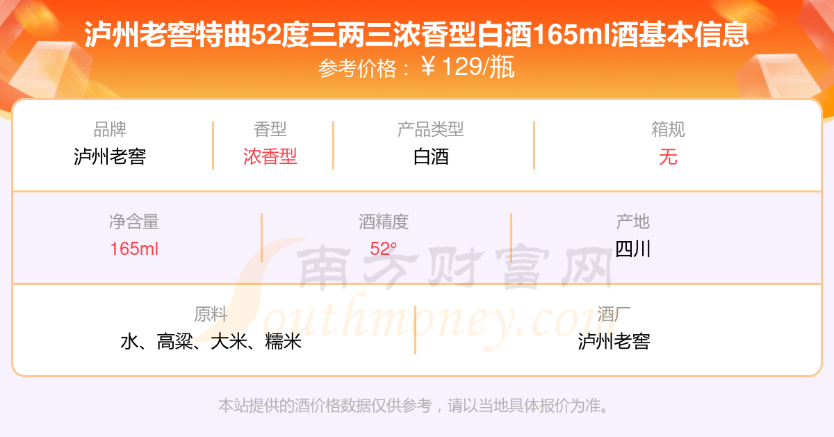 瀘州老窖特曲52度三兩三濃香型白酒165ml基本信息