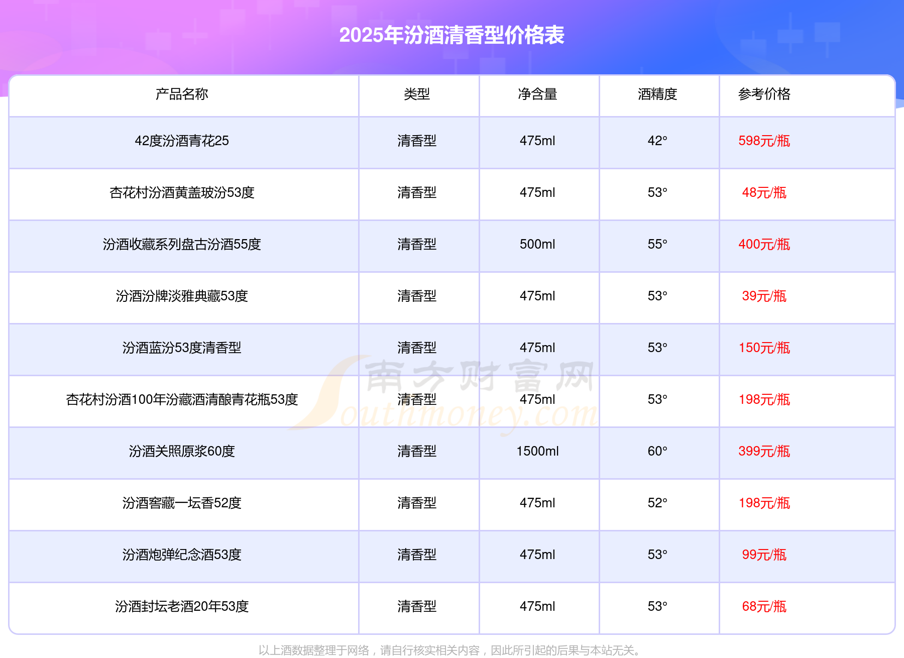 當(dāng)下汾酒清香型酒價(jià)格最高的酒為汾酒原漿一壇香60°3000ml,參考價(jià)2180元/瓶,而汾酒清香型酒價(jià)格最低的是汾酒百年汾杏酒純釀53度,參考價(jià)28元/瓶,價(jià)格高低差為2152元/瓶。
