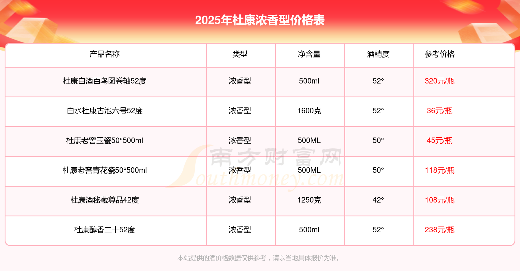 杜康白酒百鳥圖卷軸52度參考價320元/瓶、杜康醇香二十52度參考價238元/瓶、杜康老窖青花瓷50°500ml參考價118元/瓶、杜康酒秘藏尊品42度參考價108元/瓶。
