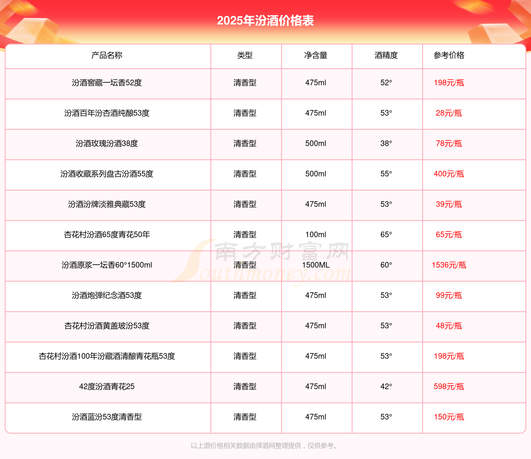 當(dāng)下汾酒價(jià)格最高的酒為汾酒原漿一壇香60°3000ml,參考價(jià)2180元/瓶,而汾酒價(jià)格最低的是汾酒百年汾杏酒純釀53度,參考價(jià)28元/瓶,價(jià)格高低差為2152元/瓶。