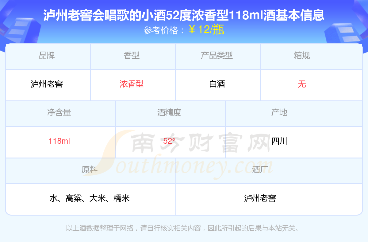 瀘州老窖會(huì)唱歌的小酒52度濃香型118ml基本信息