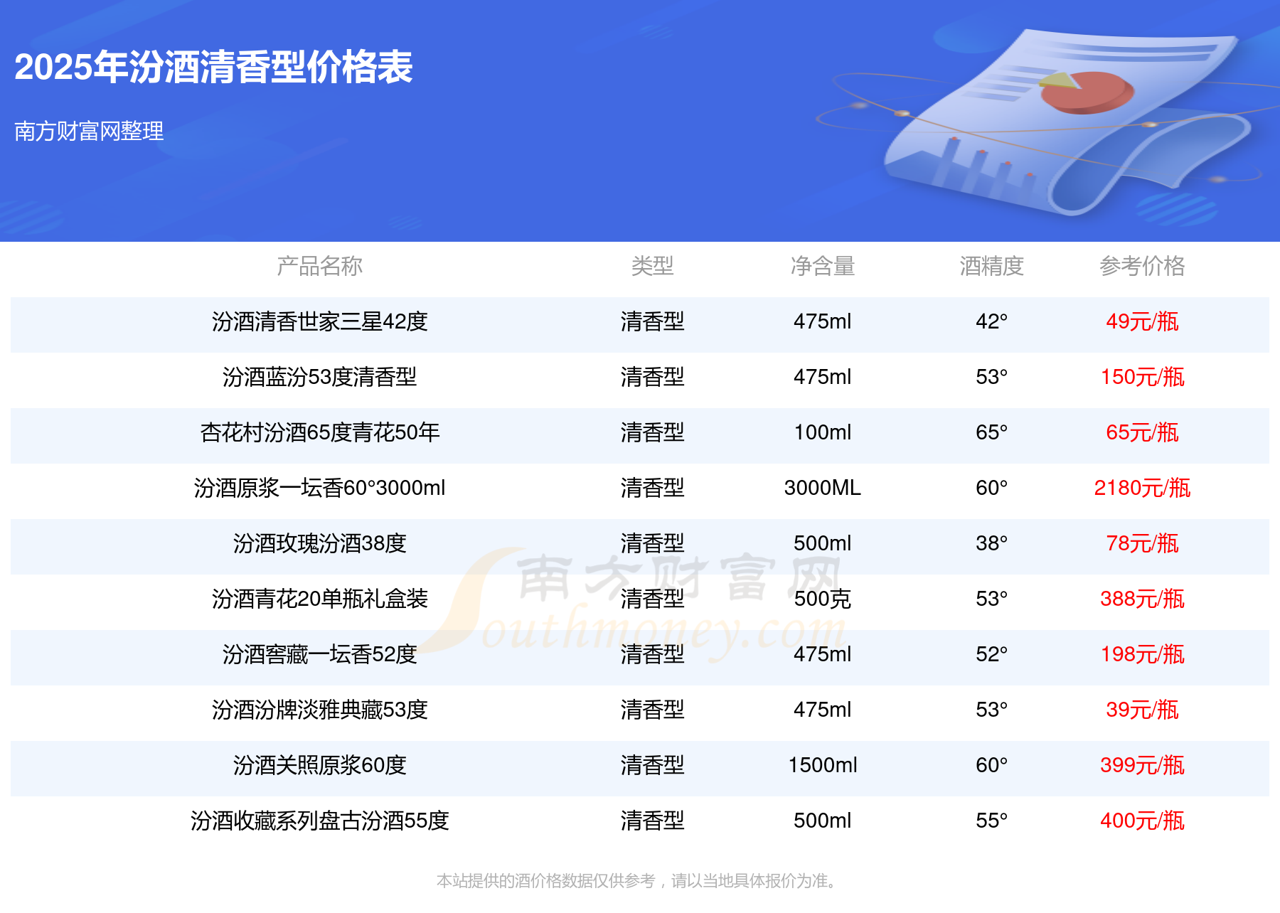 2025年,汾酒清香型酒價(jià)格最高的是汾酒原漿一壇香60°3000ml,參考價(jià)2180元,最低的是汾酒百年汾杏酒純釀53度,參考價(jià)28元,價(jià)格高低差為2152元。