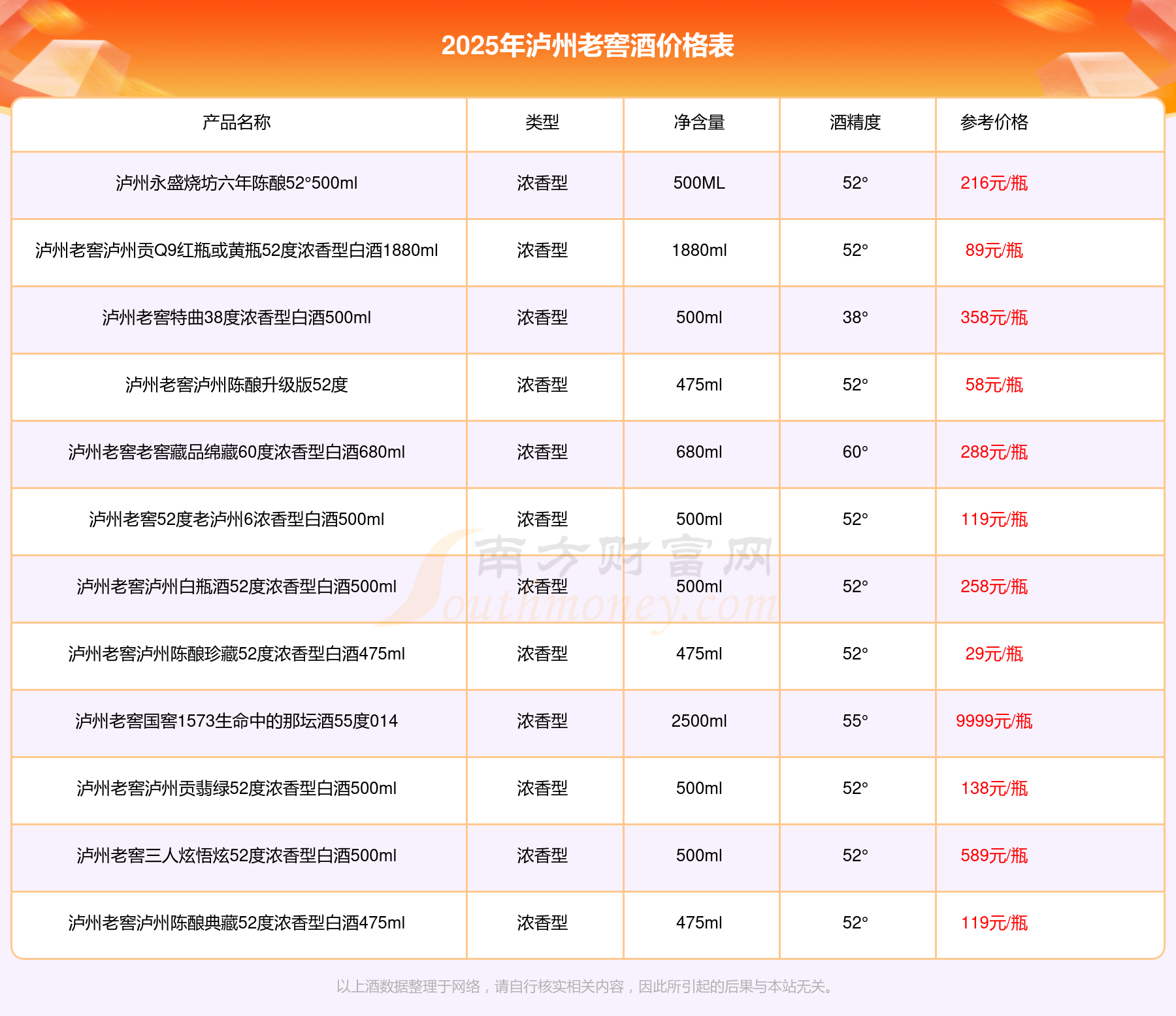 2025年,瀘州老窖酒價(jià)格最高的是瀘州老窖國(guó)窖1573春釀鼠兆豐年E 55度,參考價(jià)17999元,最低的是瀘州老窖45度五洲醉8窖經(jīng)典小酒版濃香型100ml,參考價(jià)10元,價(jià)格高低差為17989元。