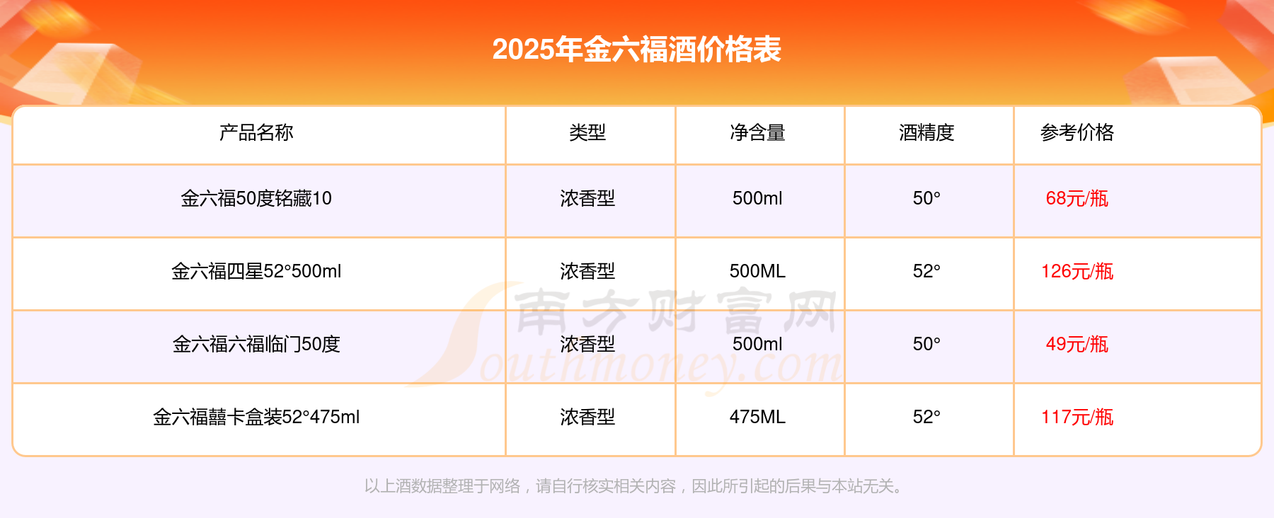 2025金六福酒最新價(jià)格:金六福四星52°500ml參考價(jià)126元/瓶、金六福囍卡盒裝52°475ml參考價(jià)117元/瓶、金六福50度銘藏10參考價(jià)68元/瓶、金六福六福臨門50度參考價(jià)49元/瓶。
