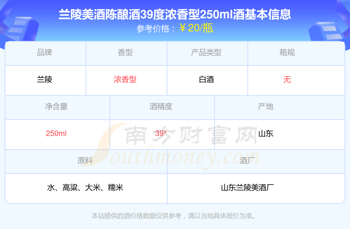 蘭陵美酒陳釀酒39度濃香型250ml基本信息