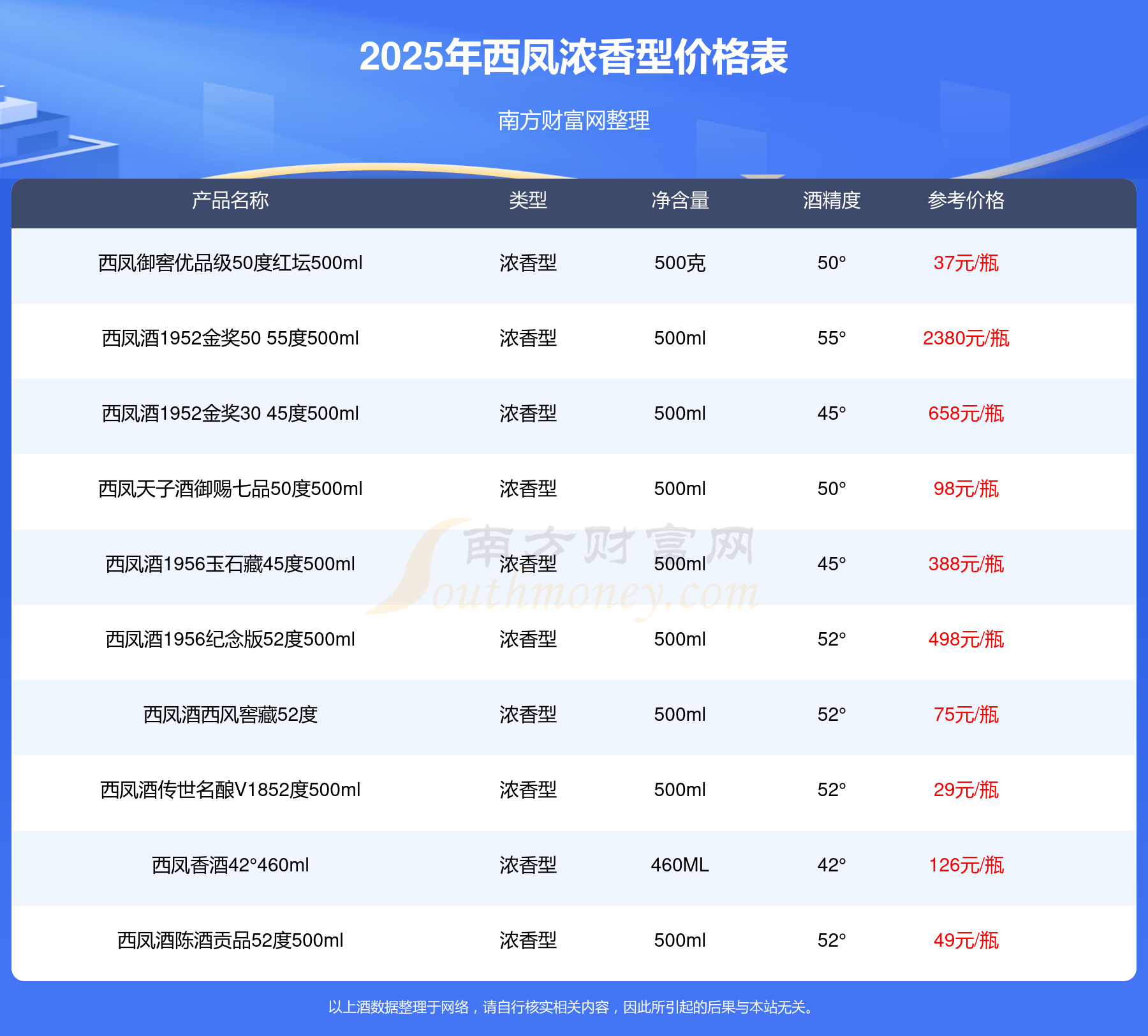 2025西鳳濃香型酒最新價(jià)格:西鳳酒 酒海私藏55度3000ml參考價(jià)8880元/瓶、西鳳酒1952金獎(jiǎng)50 55度500ml參考價(jià)2380元/瓶、西鳳酒2013年產(chǎn)老酒鳳香經(jīng)典30年52度500ml參考價(jià)1280元/瓶、西鳳酒1952金獎(jiǎng)30 55度500ml參考價(jià)898元/瓶。