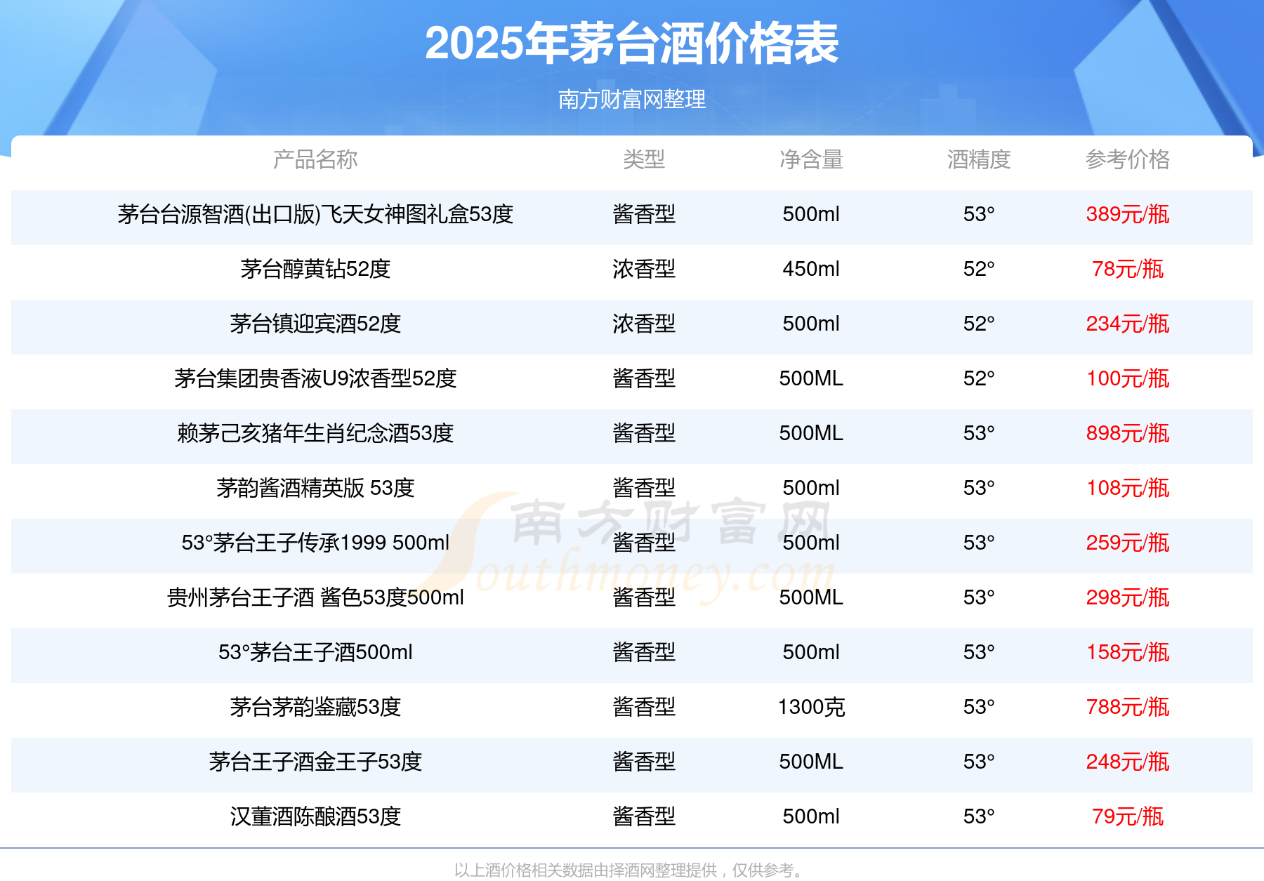 2025年,華茅鑒藏 醬香型白酒 3L 53°、53度五星茅臺生肖酒丁酉雞年、貴州茅臺己亥豬年生肖酒53°500ml、53度五星茅臺生肖酒戊戌狗年、飛天茅臺53°500ml(2015年)、茅臺王子酒己亥豬年生肖紀(jì)念酒53度2.5L、茅臺1935醬香型53度等茅臺酒參考價(jià)格如下:華茅鑒藏 醬香型白酒 3L 53°參考價(jià)8388元、53度五星茅臺生肖酒丁酉雞年參考價(jià)2798元、貴州茅臺己亥豬年生肖酒53°500ml參考價(jià)2699元、53度五星茅臺生肖酒戊戌狗年參考價(jià)2698元、飛天茅臺53°500ml(2015年)參考價(jià)2199元、茅臺王子酒己亥豬年生肖紀(jì)念酒53度2.5L參考價(jià)2099元、茅臺1935醬香型53度參考價(jià)1799元。