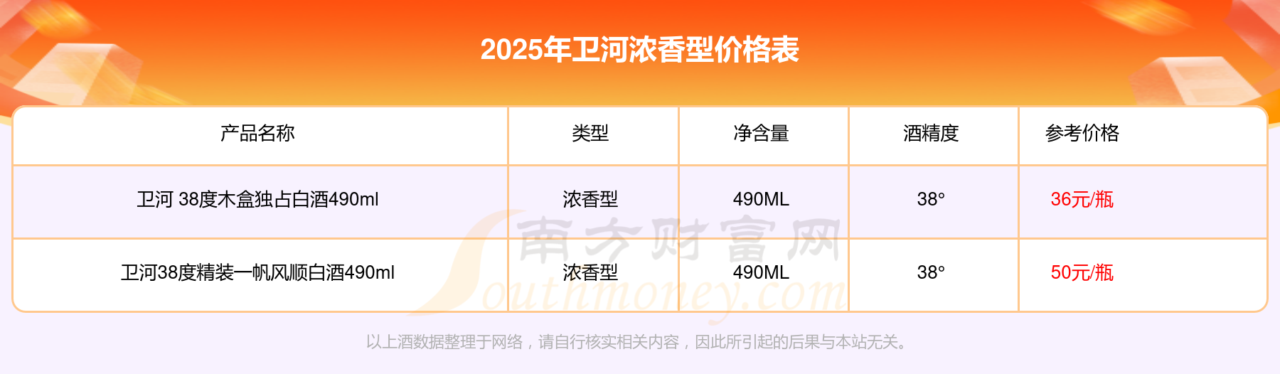 2025年,衛(wèi)河38度精裝一帆風(fēng)順白酒490ml、衛(wèi)河 38度木盒獨(dú)占白酒490ml等衛(wèi)河濃香型酒價(jià)格如下: