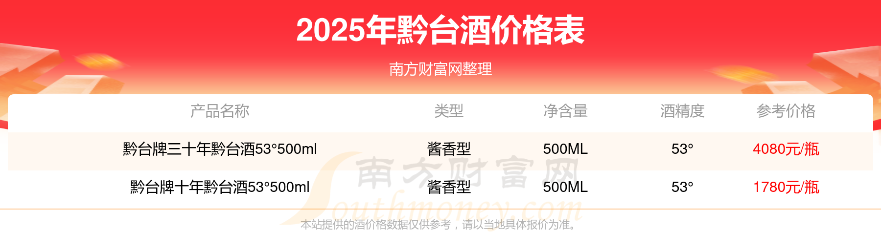 2025年黔臺(tái)酒黔臺(tái)牌三十年黔臺(tái)酒53°500ml、黔臺(tái)牌十年黔臺(tái)酒53°500ml等最新價(jià)格如下:黔臺(tái)牌三十年黔臺(tái)酒53°500ml參考價(jià)4080元/瓶、黔臺(tái)牌十年黔臺(tái)酒53°500ml參考價(jià)1780元/瓶。