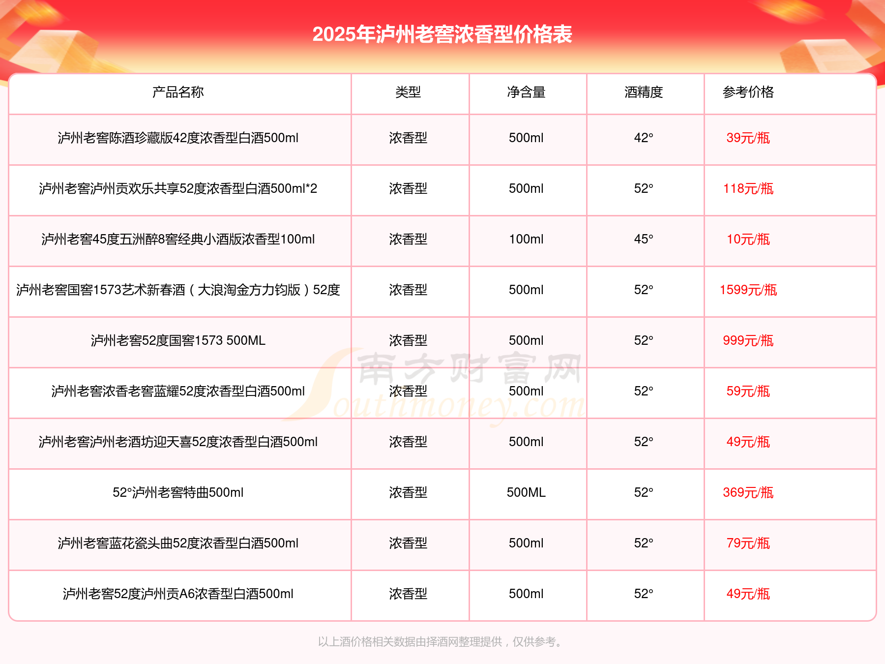 2025年瀘州老窖濃香型酒瀘州老窖國窖1573春釀鼠兆豐年E 55度、瀘州老窖國窖1573生命中的那壇酒55度014、瀘州老窖國窖1573春釀鼠兆豐年A 55度、瀘州老窖國窖1573生命中的那壇酒55度013濃香型白酒1000ml、瀘州老窖國窖1573生命中的那壇酒55度009 1000ml等最新價(jià)格如下:瀘州老窖國窖1573春釀鼠兆豐年E 55度參考價(jià)17999元/瓶、瀘州老窖國窖1573生命中的那壇酒55度014參考價(jià)9999元/瓶、瀘州老窖國窖1573春釀鼠兆豐年A 55度參考價(jià)5088元/瓶、瀘州老窖國窖1573生命中的那壇酒55度013濃香型白酒1000ml參考價(jià)4988元/瓶、瀘州老窖國窖1573生命中的那壇酒55度009 1000ml參考價(jià)4288元/瓶。
