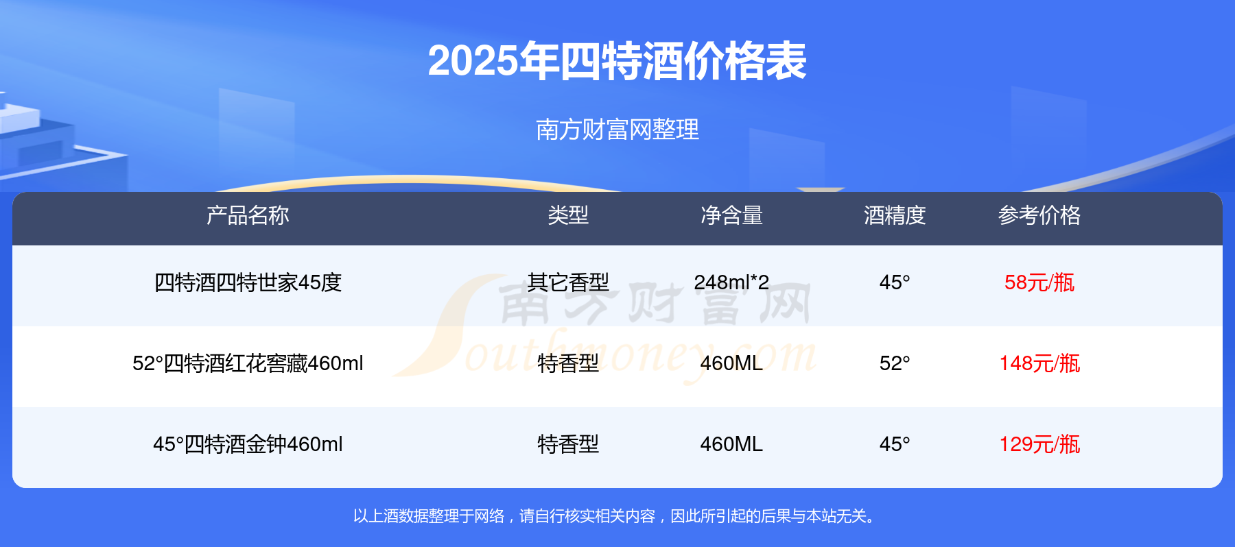 52°四特酒紅花窖藏460ml參考價148元/瓶、45°四特酒金鐘460ml參考價129元/瓶、四特酒四特世家45度參考價58元/瓶。