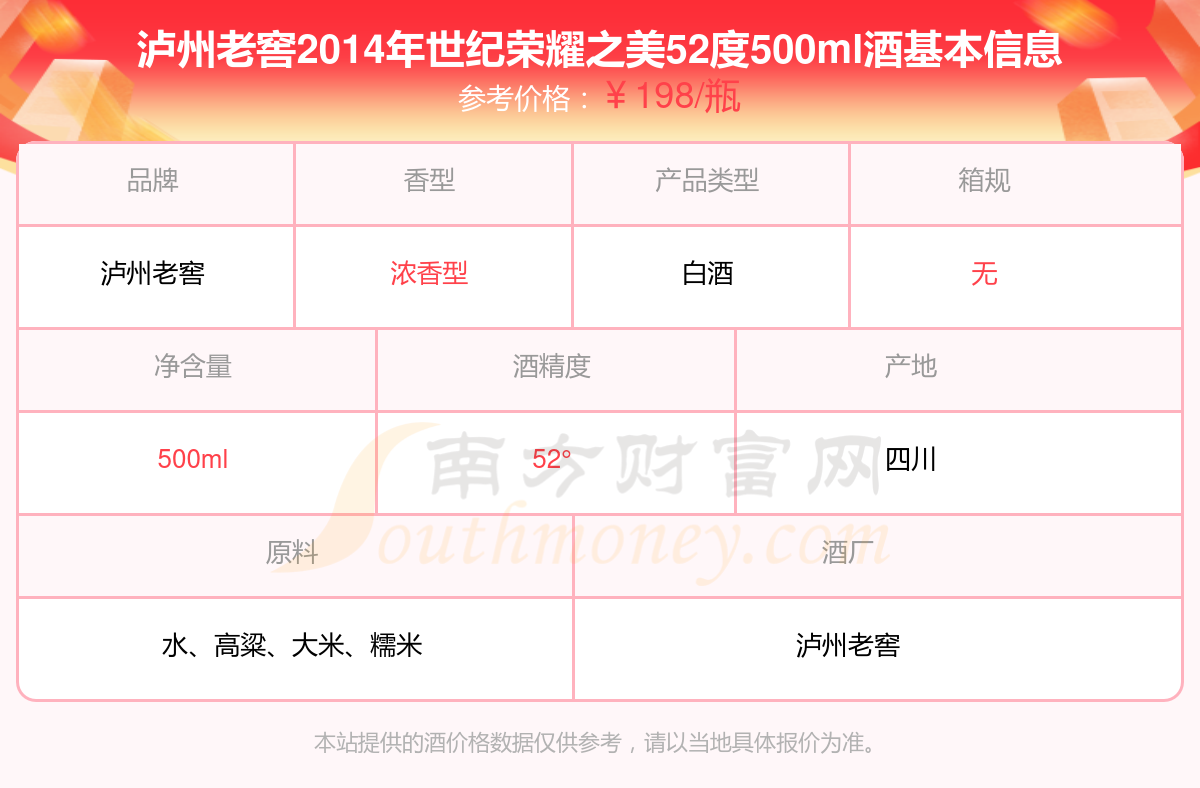 瀘州老窖2014年世紀榮耀之美52度500ml基本信息