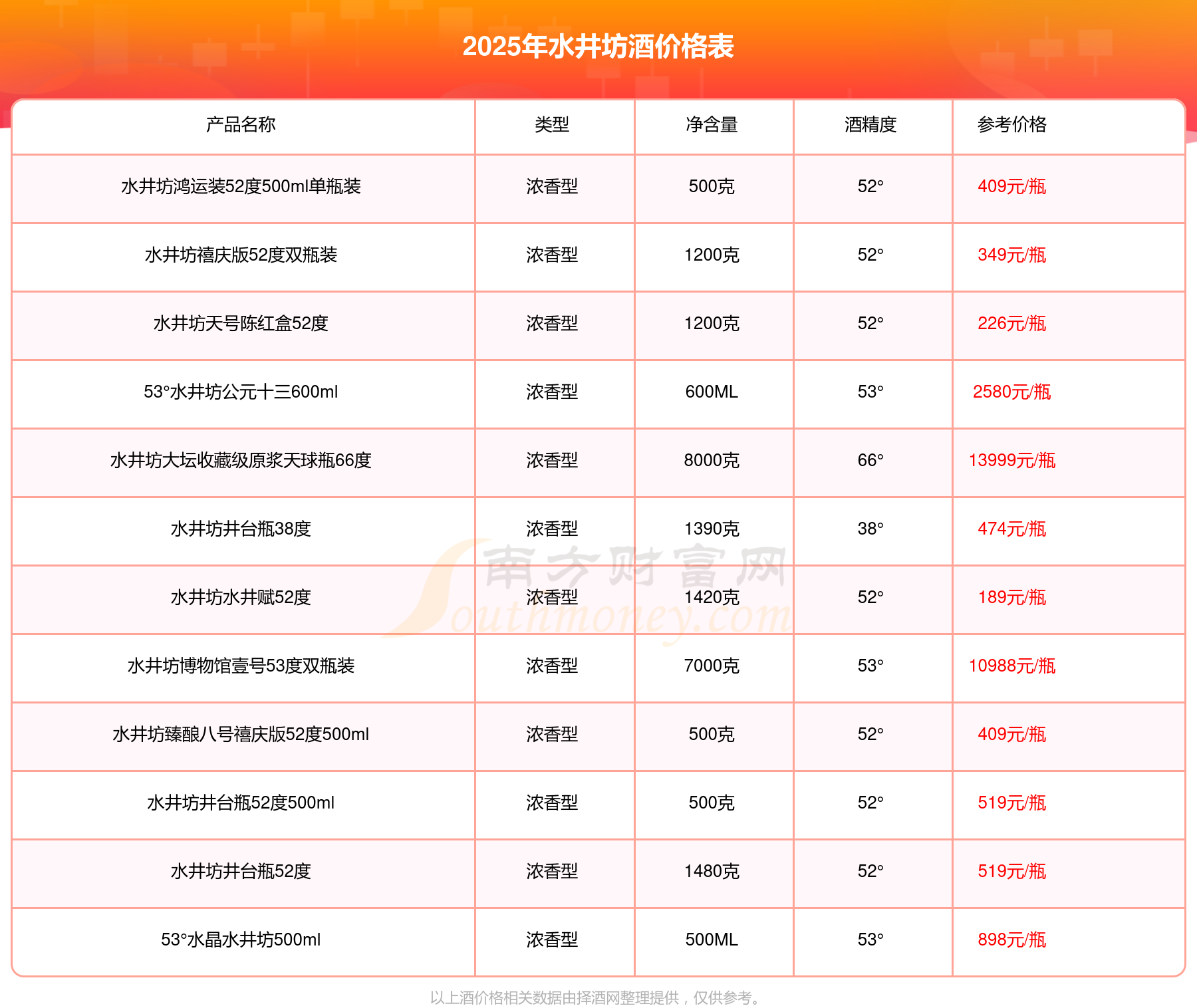 2025年,水井坊大壇收藏級原漿天球瓶66度、水井坊博物館壹號53度雙瓶裝、53°水井坊公元十三600ml、水井坊梅蘭竹菊52度濃香型600ml4瓶、水井坊菁翠52度500ml、井臺珍藏版龍53度1000ml單瓶裝、井臺珍藏版鳳53度1000ml單瓶裝等水井坊酒參考價格如下:水井坊大壇收藏級原漿天球瓶66度參考價13999元、水井坊博物館壹號53度雙瓶裝參考價10988元、53°水井坊公元十三600ml參考價2580元、水井坊梅蘭竹菊52度濃香型600ml4瓶參考價1999元、水井坊菁翠52度500ml參考價1650元、井臺珍藏版龍53度1000ml單瓶裝參考價1298元、井臺珍藏版鳳53度1000ml單瓶裝參考價1298元。