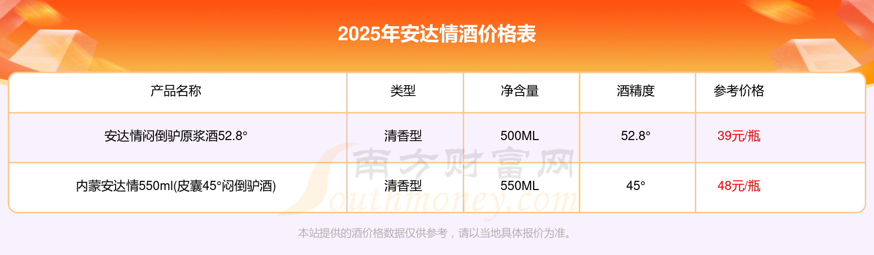 當(dāng)前安達(dá)情酒價(jià)格最高的酒為內(nèi)蒙安達(dá)情550ml(皮囊45°悶倒驢酒),參考價(jià)48元/瓶,而安達(dá)情酒價(jià)格最低的是安達(dá)情悶倒驢原漿酒52.8°,參考價(jià)39元/瓶,價(jià)格高低差為9元/瓶。
