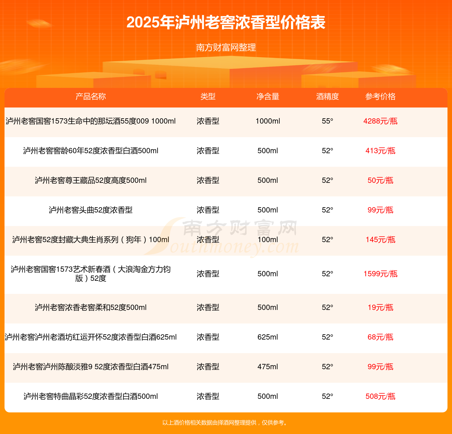 瀘州老窖國(guó)窖1573春釀鼠兆豐年E 55度參考價(jià)17999元/瓶、瀘州老窖國(guó)窖1573生命中的那壇酒55度014參考價(jià)9999元/瓶、瀘州老窖國(guó)窖1573春釀鼠兆豐年A 55度參考價(jià)5088元/瓶、瀘州老窖國(guó)窖1573生命中的那壇酒55度013濃香型白酒1000ml參考價(jià)4988元/瓶、瀘州老窖國(guó)窖1573生命中的那壇酒55度009 1000ml參考價(jià)4288元/瓶、瀘州老窖國(guó)窖1573中國(guó)品味52度濃香型白酒500ml參考價(jià)2888元/瓶。