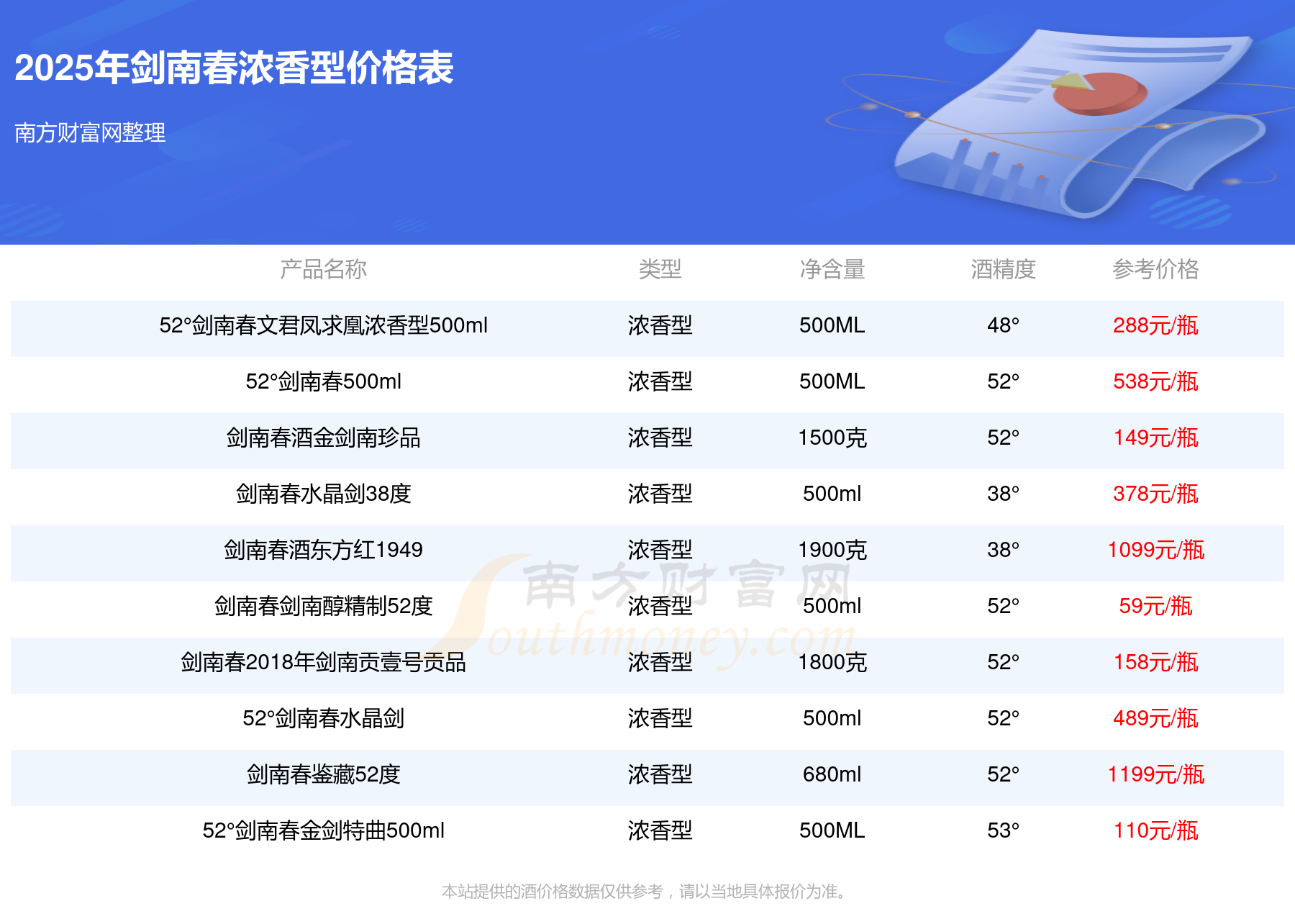 2025年劍南春濃香型酒劍南春鑒藏52度、52°劍南春珍藏級特釀500ml、劍南春酒東方紅1949、52°劍南春500ml等最新價格如下: