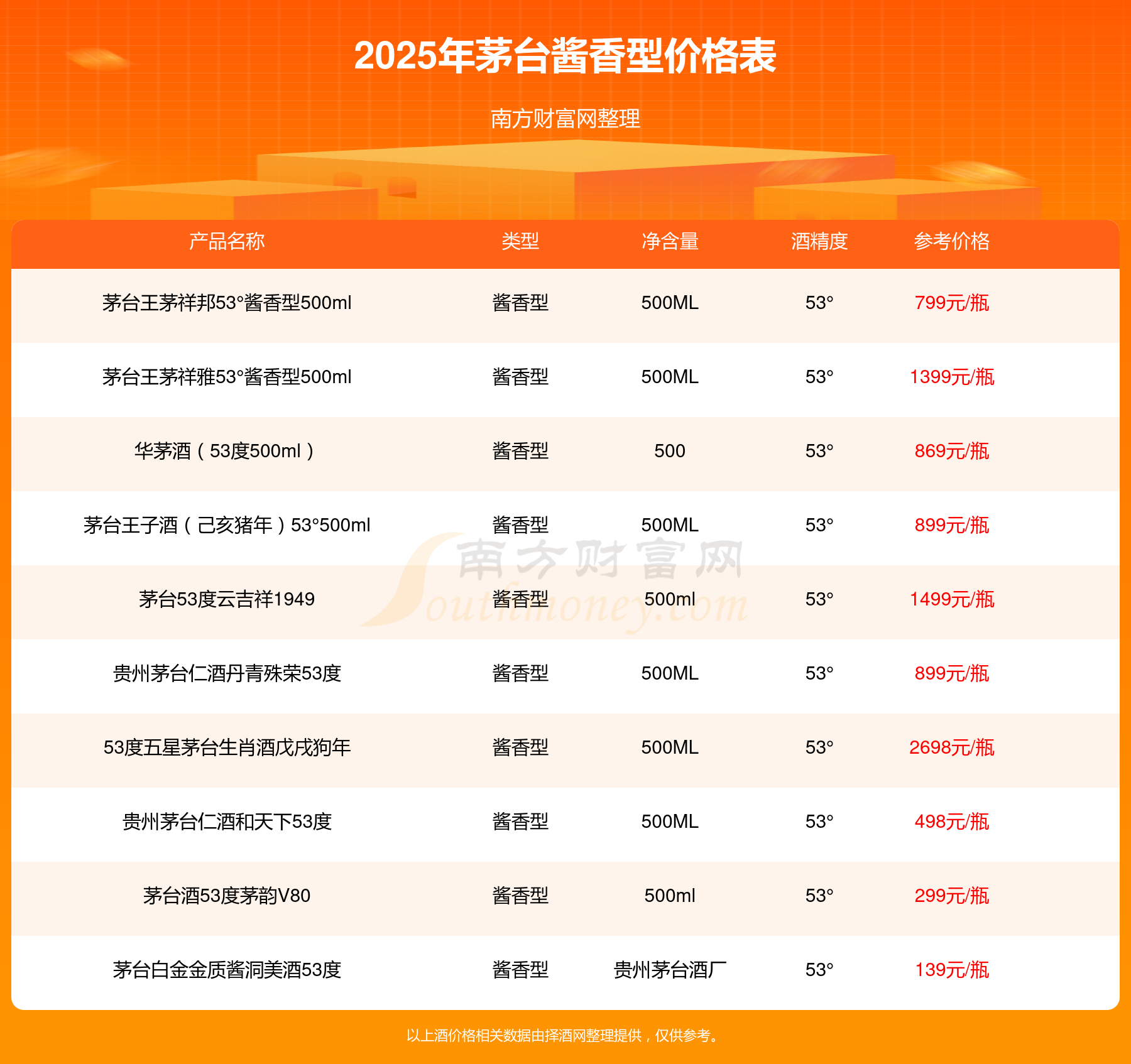 2025年茅臺醬香型酒華茅鑒藏 醬香型白酒 3L 53°、53度五星茅臺生肖酒丁酉雞年、貴州茅臺己亥豬年生肖酒53°500ml、53度五星茅臺生肖酒戊戌狗年、飛天茅臺53°500ml(2015年)、茅臺王子酒己亥豬年生肖紀(jì)念酒53度2.5L、茅臺1935醬香型53度等最新價格如下:華茅鑒藏 醬香型白酒 3L 53°參考價8388元/瓶、53度五星茅臺生肖酒丁酉雞年參考價2798元/瓶、貴州茅臺己亥豬年生肖酒53°500ml參考價2699元/瓶、53度五星茅臺生肖酒戊戌狗年參考價2698元/瓶、飛天茅臺53°500ml(2015年)參考價2199元/瓶、茅臺王子酒己亥豬年生肖紀(jì)念酒53度2.5L參考價2099元/瓶、茅臺1935醬香型53度參考價1799元/瓶。