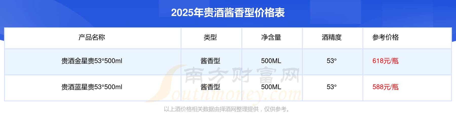 2025年,貴酒金星貴53°500ml、貴酒藍(lán)星貴53°500ml等貴酒醬香型酒價(jià)格如下: