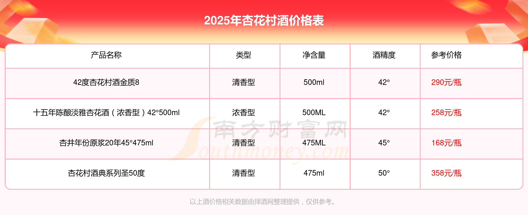 杏花村酒典系列圣50度參考價(jià)358元/瓶、42度杏花村酒金質(zhì)8參考價(jià)290元/瓶、十五年陳釀淡雅杏花酒(濃香型)42°500ml參考價(jià)258元/瓶、杏井年份原漿20年45°475ml參考價(jià)168元/瓶。
