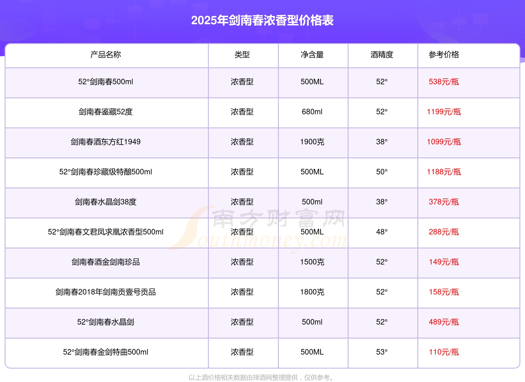 2025年劍南春濃香型酒劍南春鑒藏52度、52°劍南春珍藏級特釀500ml、劍南春酒東方紅1949、52°劍南春500ml、52°劍南春水晶劍等最新價格如下:劍南春鑒藏52度參考價1199元/瓶、52°劍南春珍藏級特釀500ml參考價1188元/瓶、劍南春酒東方紅1949參考價1099元/瓶、52°劍南春500ml參考價538元/瓶、52°劍南春水晶劍參考價489元/瓶。
