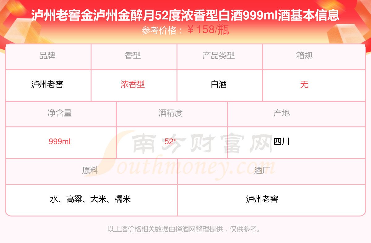 瀘州老窖金瀘州金醉月52度濃香型白酒999ml基本信息