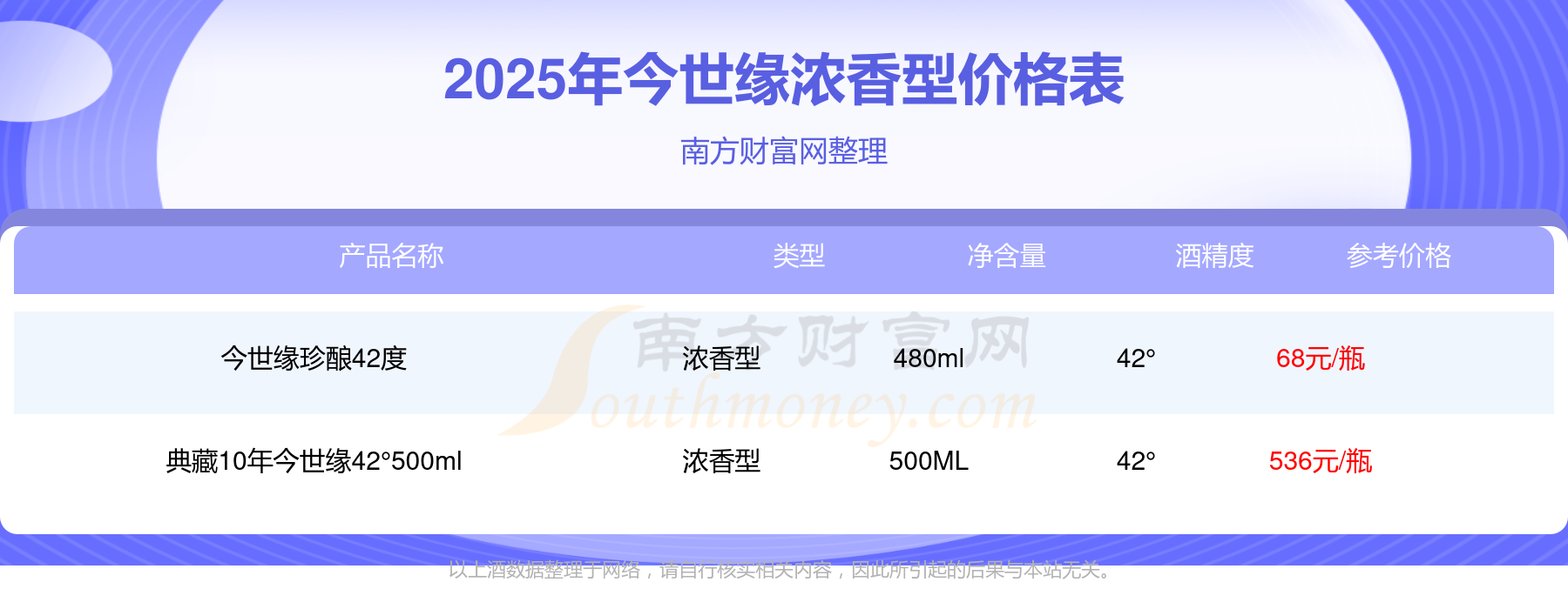 2025年,今世緣濃香型酒價格最高的是典藏10年今世緣42°500ml,參考價536元,最低的是今世緣珍釀42度,參考價68元,價格高低差為468元。