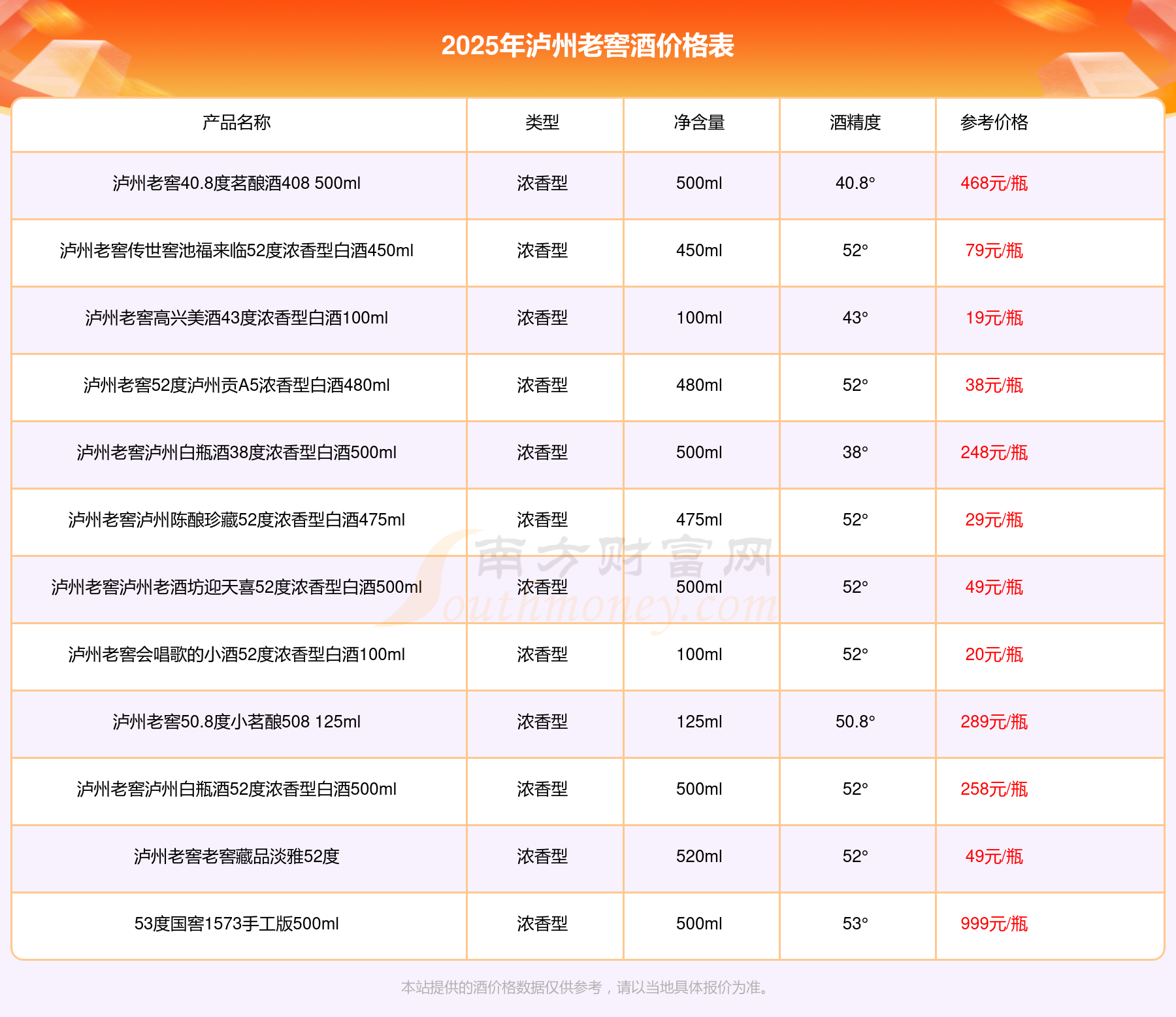瀘州老窖酒最新價格2025:瀘州老窖國窖1573春釀鼠兆豐年E 55度參考價17999元/瓶、瀘州老窖國窖1573生命中的那壇酒55度014參考價9999元/瓶、瀘州老窖國窖1573春釀鼠兆豐年A 55度參考價5088元/瓶、瀘州老窖國窖1573生命中的那壇酒55度013濃香型白酒1000ml參考價4988元/瓶。