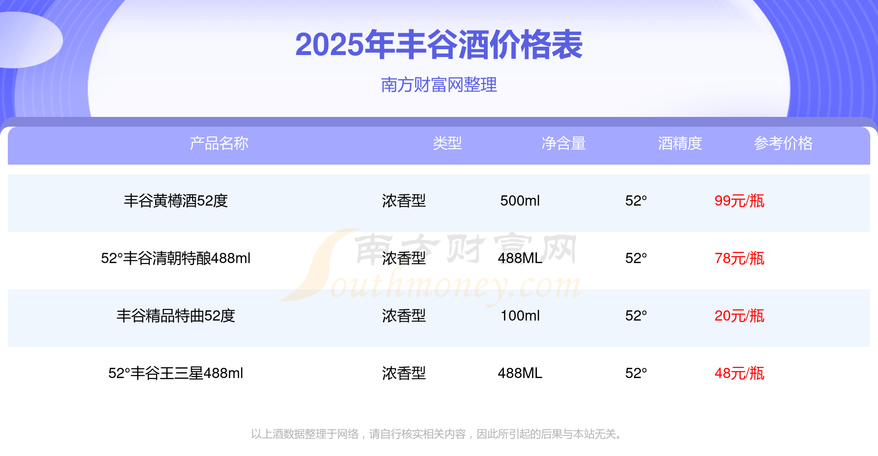豐谷黃樽酒52度參考價(jià)99元/瓶、52°豐谷清朝特釀488ml參考價(jià)78元/瓶、52°豐谷王三星488ml參考價(jià)48元/瓶、豐谷精品特曲52度參考價(jià)20元/瓶。