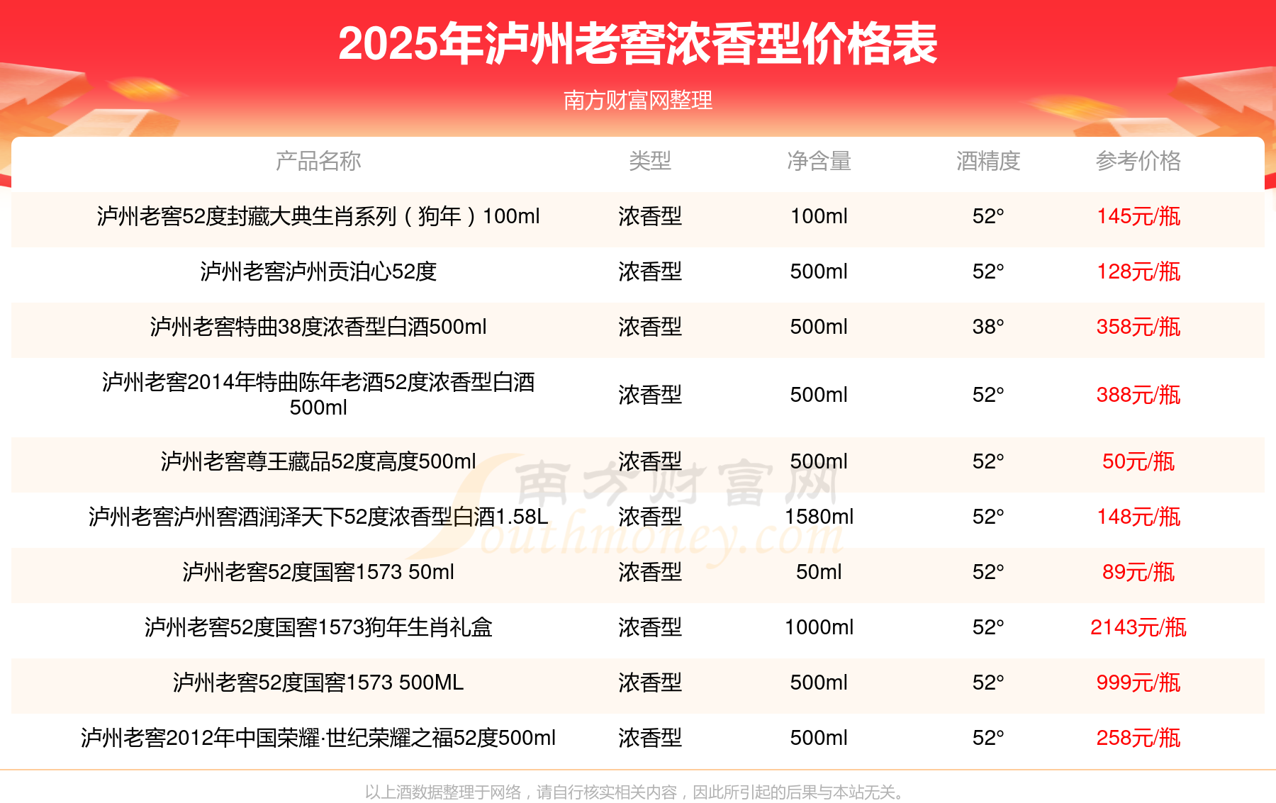 2025年瀘州老窖濃香型酒瀘州老窖國窖1573春釀鼠兆豐年E 55度、瀘州老窖國窖1573生命中的那壇酒55度014、瀘州老窖國窖1573春釀鼠兆豐年A 55度、瀘州老窖國窖1573生命中的那壇酒55度013濃香型白酒1000ml、瀘州老窖國窖1573生命中的那壇酒55度009 1000ml、瀘州老窖國窖1573中國品味52度濃香型白酒500ml等最新價格如下:瀘州老窖國窖1573春釀鼠兆豐年E 55度參考價17999元/瓶、瀘州老窖國窖1573生命中的那壇酒55度014參考價9999元/瓶、瀘州老窖國窖1573春釀鼠兆豐年A 55度參考價5088元/瓶、瀘州老窖國窖1573生命中的那壇酒55度013濃香型白酒1000ml參考價4988元/瓶、瀘州老窖國窖1573生命中的那壇酒55度009 1000ml參考價4288元/瓶、瀘州老窖國窖1573中國品味52度濃香型白酒500ml參考價2888元/瓶。