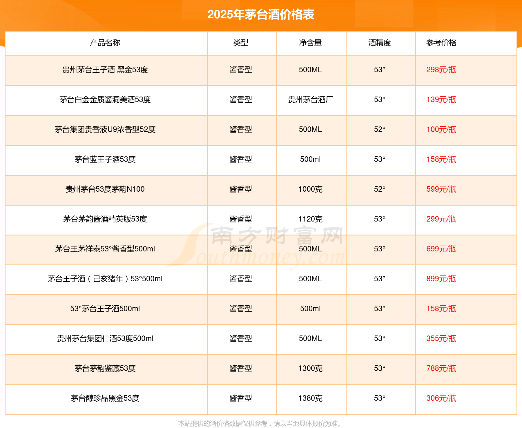 茅臺(tái)酒最新價(jià)格2025:華茅鑒藏 醬香型白酒 3L 53°參考價(jià)8388元/瓶、53度五星茅臺(tái)生肖酒丁酉雞年參考價(jià)2798元/瓶、貴州茅臺(tái)己亥豬年生肖酒53°500ml參考價(jià)2699元/瓶、53度五星茅臺(tái)生肖酒戊戌狗年參考價(jià)2698元/瓶、飛天茅臺(tái)53°500ml(2015年)參考價(jià)2199元/瓶。