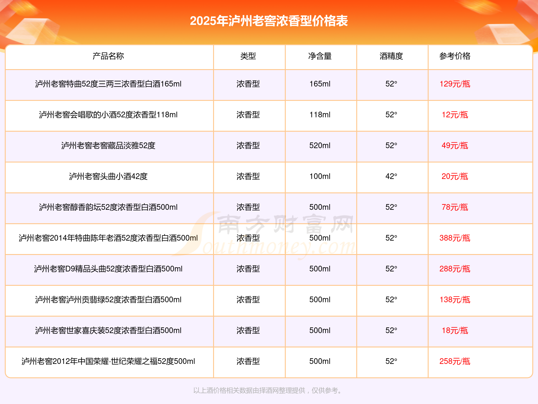 2025年瀘州老窖濃香型價(jià)格最高的酒是瀘州老窖國(guó)窖1573春釀鼠兆豐年E 55度,參考價(jià)17999元/瓶,最低的是瀘州老窖45度五洲醉8窖經(jīng)典小酒版濃香型100ml,參考價(jià)10元/瓶,價(jià)格高低差為17989元/瓶。