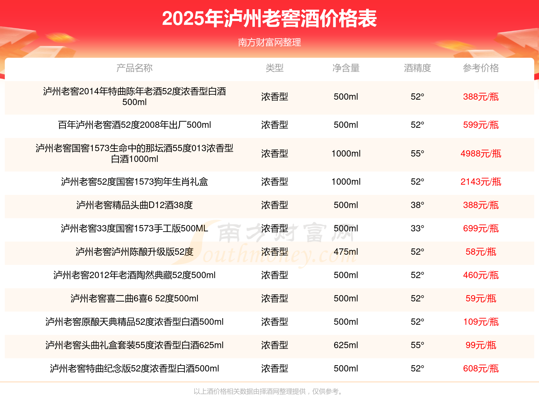 瀘州老窖酒最新價(jià)格2025:瀘州老窖國(guó)窖1573春釀鼠兆豐年E 55度參考價(jià)17999元/瓶、瀘州老窖國(guó)窖1573生命中的那壇酒55度014參考價(jià)9999元/瓶、瀘州老窖國(guó)窖1573春釀鼠兆豐年A 55度參考價(jià)5088元/瓶、瀘州老窖國(guó)窖1573生命中的那壇酒55度013濃香型白酒1000ml參考價(jià)4988元/瓶、瀘州老窖國(guó)窖1573生命中的那壇酒55度009 1000ml參考價(jià)4288元/瓶。