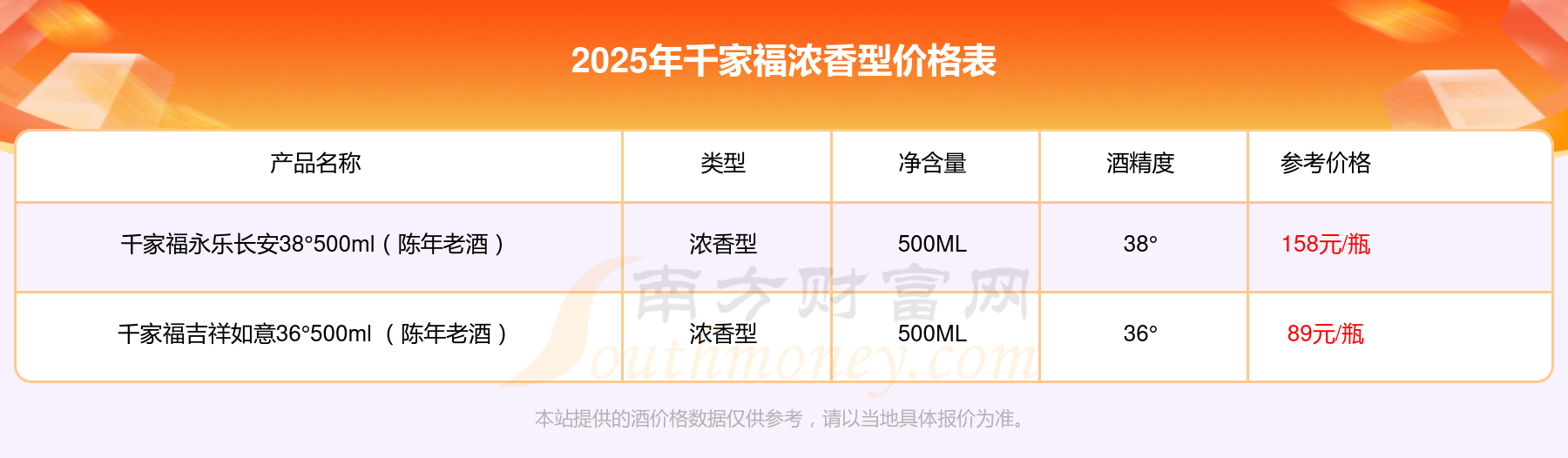 2025年千家福濃香型酒千家福永樂長安38°500ml(陳年老酒)、千家福吉祥如意36°500ml (陳年老酒)等最新價格如下: