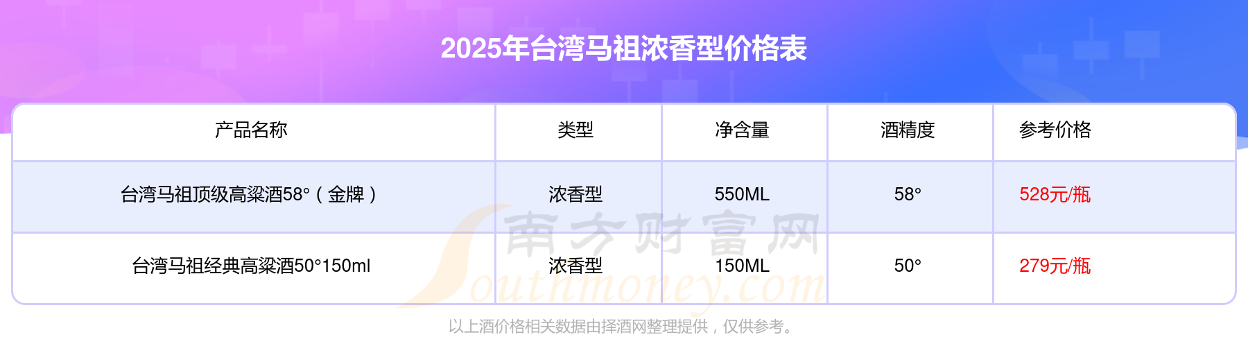 臺灣馬祖頂級高粱酒58°(金牌)參考價528元/瓶、臺灣馬祖經(jīng)典高粱酒50°150ml參考價279元/瓶。