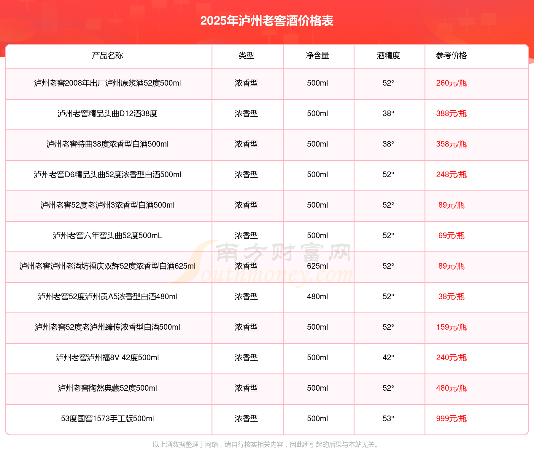 瀘州老窖國(guó)窖1573春釀鼠兆豐年E 55度參考價(jià)17999元/瓶、瀘州老窖國(guó)窖1573生命中的那壇酒55度014參考價(jià)9999元/瓶、瀘州老窖國(guó)窖1573春釀鼠兆豐年A 55度參考價(jià)5088元/瓶、瀘州老窖國(guó)窖1573生命中的那壇酒55度013濃香型白酒1000ml參考價(jià)4988元/瓶、瀘州老窖國(guó)窖1573生命中的那壇酒55度009 1000ml參考價(jià)4288元/瓶、瀘州老窖國(guó)窖1573中國(guó)品味52度濃香型白酒500ml參考價(jià)2888元/瓶、瀘州老窖國(guó)窖1573許燎源概念作品58度濃香型白酒1000ml參考價(jià)2680元/瓶。