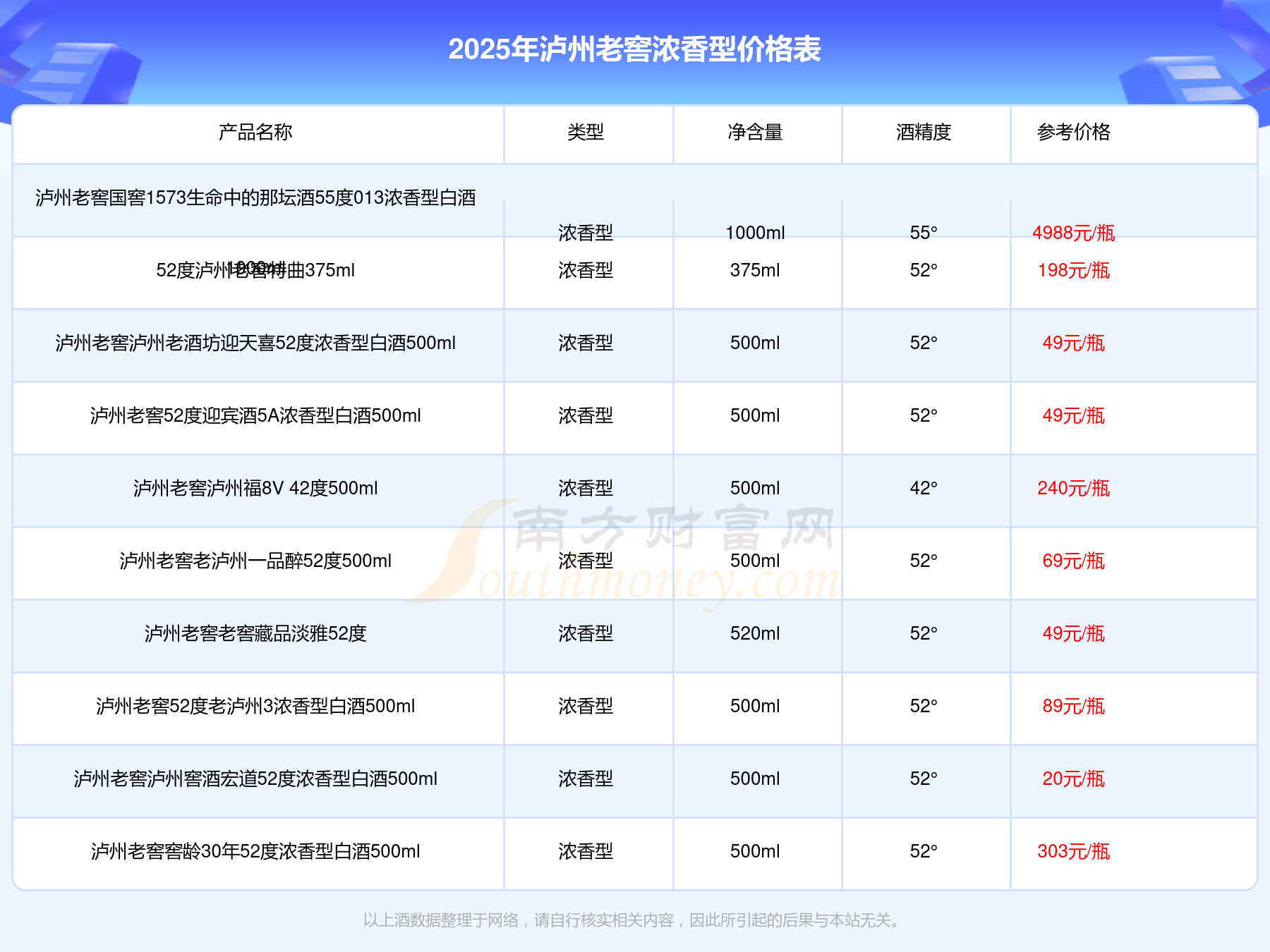 2025年瀘州老窖濃香型酒瀘州老窖國窖1573春釀鼠兆豐年E 55度、瀘州老窖國窖1573生命中的那壇酒55度014、瀘州老窖國窖1573春釀鼠兆豐年A 55度等最新價格如下:瀘州老窖國窖1573春釀鼠兆豐年E 55度參考價17999元/瓶、瀘州老窖國窖1573生命中的那壇酒55度014參考價9999元/瓶、瀘州老窖國窖1573春釀鼠兆豐年A 55度參考價5088元/瓶。