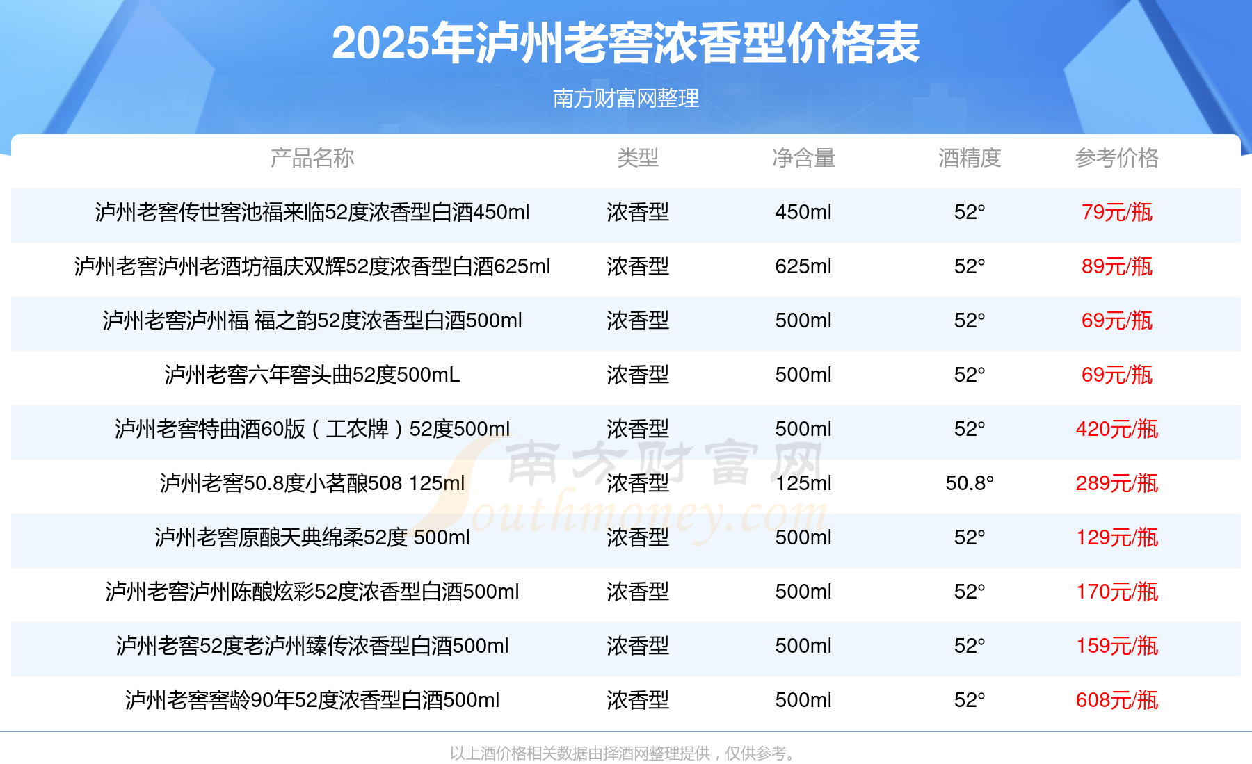 瀘州老窖國(guó)窖1573春釀鼠兆豐年E 55度參考價(jià)17999元/瓶、瀘州老窖國(guó)窖1573生命中的那壇酒55度014參考價(jià)9999元/瓶、瀘州老窖國(guó)窖1573春釀鼠兆豐年A 55度參考價(jià)5088元/瓶、瀘州老窖國(guó)窖1573生命中的那壇酒55度013濃香型白酒1000ml參考價(jià)4988元/瓶、瀘州老窖國(guó)窖1573生命中的那壇酒55度009 1000ml參考價(jià)4288元/瓶、瀘州老窖國(guó)窖1573中國(guó)品味52度濃香型白酒500ml參考價(jià)2888元/瓶、瀘州老窖國(guó)窖1573許燎源概念作品58度濃香型白酒1000ml參考價(jià)2680元/瓶。