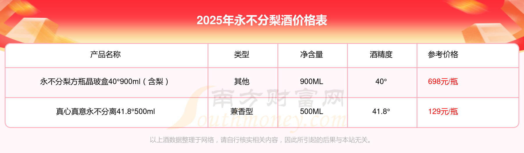 2025年永不分梨價格最高的酒是永不分梨方瓶晶玻盒40°900ml(含梨),參考價698元/瓶,最低的是真心真意永不分離41.8°500ml,參考價129元/瓶,價格高低差為569元/瓶。