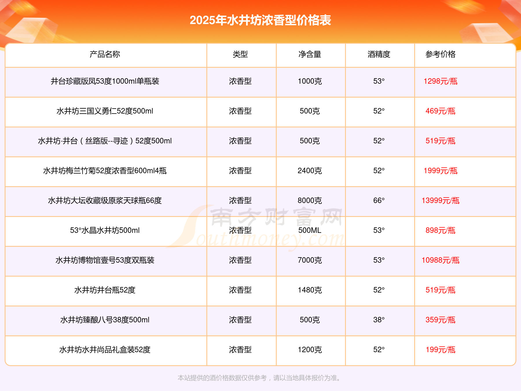 水井坊濃香型酒最新價(jià)格2025:水井坊大壇收藏級(jí)原漿天球瓶66度參考價(jià)13999元/瓶、水井坊博物館壹號(hào)53度雙瓶裝參考價(jià)10988元/瓶、53°水井坊公元十三600ml參考價(jià)2580元/瓶、水井坊梅蘭竹菊52度濃香型600ml4瓶參考價(jià)1999元/瓶、水井坊菁翠52度500ml參考價(jià)1650元/瓶。