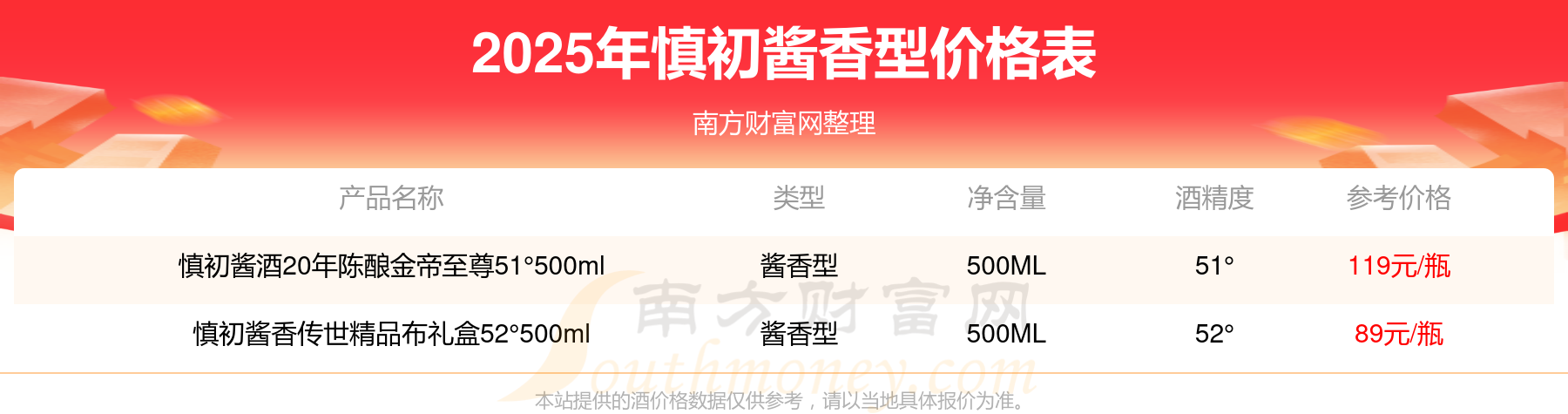2025年慎初醬香型酒慎初醬酒20年陳釀金帝至尊51°500ml、慎初醬香傳世精品布禮盒52°500ml等最新價(jià)格如下:慎初醬酒20年陳釀金帝至尊51°500ml參考價(jià)119元/瓶、慎初醬香傳世精品布禮盒52°500ml參考價(jià)89元/瓶。