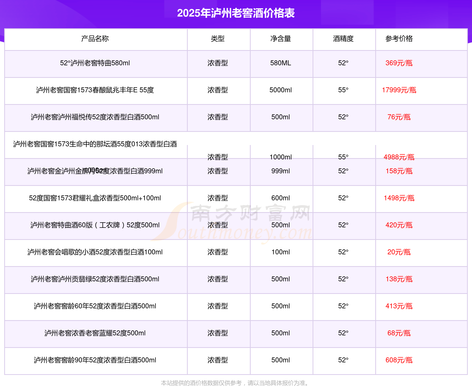 瀘州老窖酒最新價(jià)格2025:瀘州老窖國(guó)窖1573春釀鼠兆豐年E 55度參考價(jià)17999元/瓶、瀘州老窖國(guó)窖1573生命中的那壇酒55度014參考價(jià)9999元/瓶、瀘州老窖國(guó)窖1573春釀鼠兆豐年A 55度參考價(jià)5088元/瓶、瀘州老窖國(guó)窖1573生命中的那壇酒55度013濃香型白酒1000ml參考價(jià)4988元/瓶、瀘州老窖國(guó)窖1573生命中的那壇酒55度009 1000ml參考價(jià)4288元/瓶。